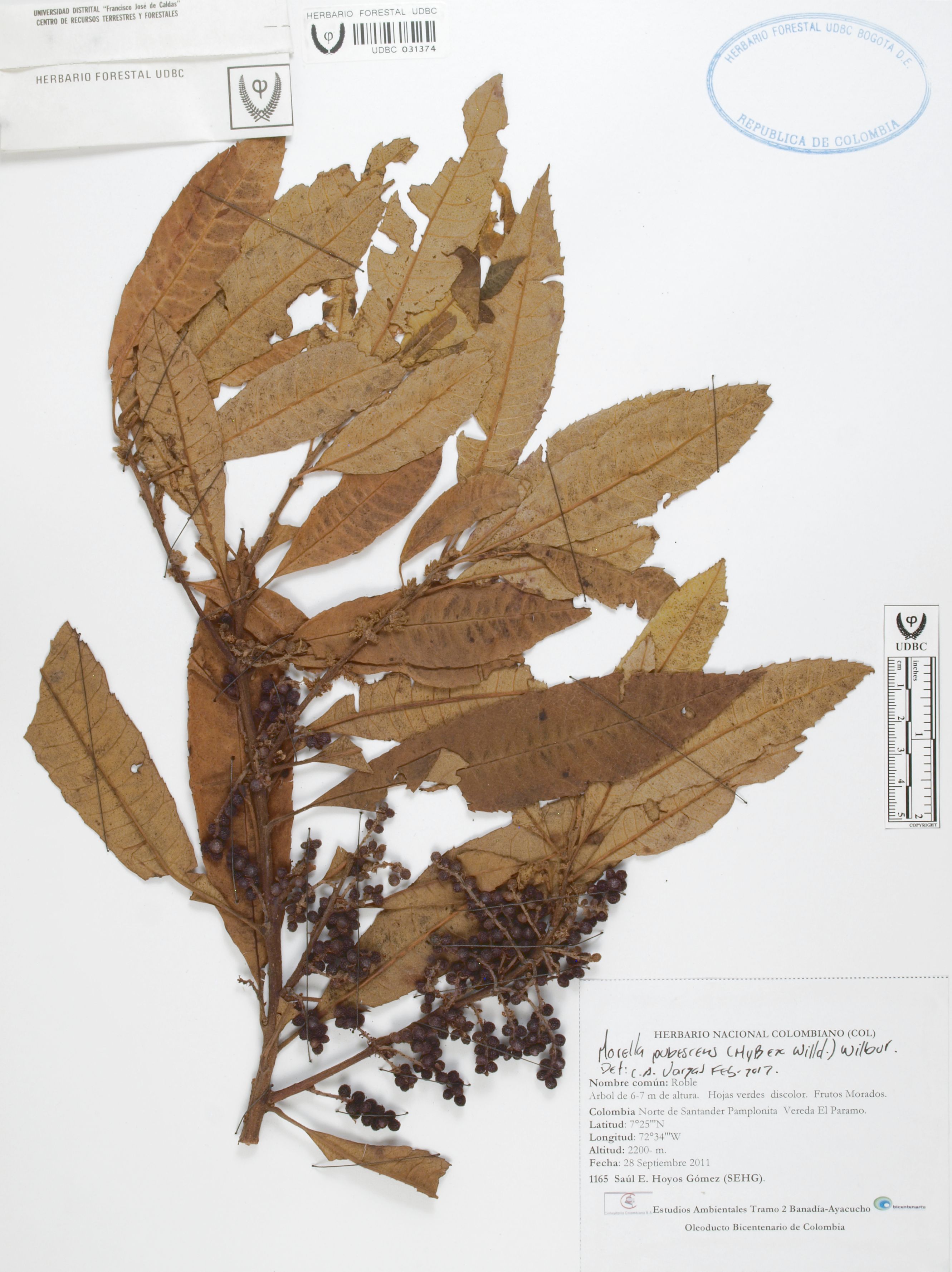 Fotografía del ejemplar Hoyos, S. 1165, determinado como Morella pubescens en el año 2012