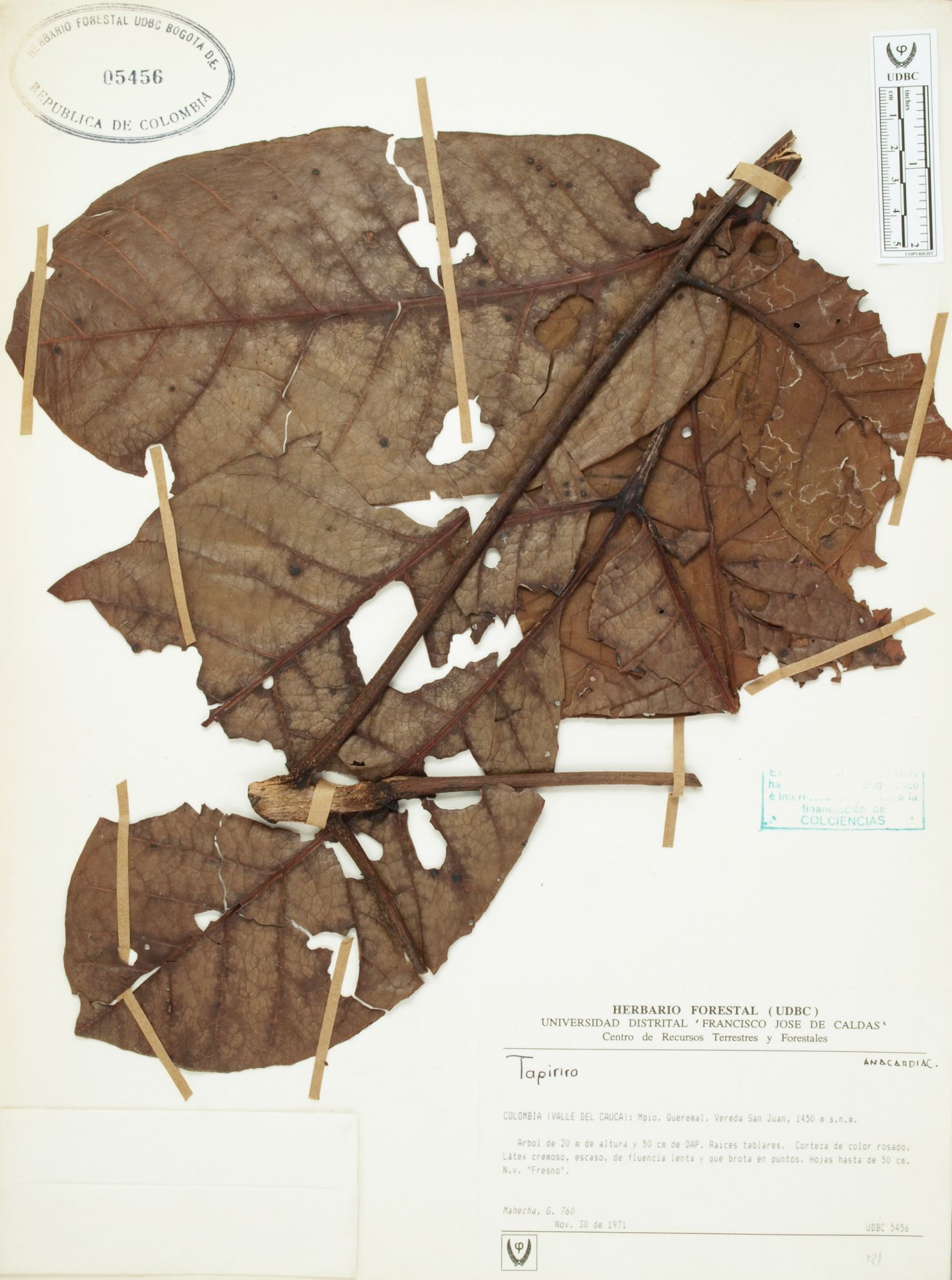 Fotografía del ejemplar Mahecha, G. 760, determinado como Tapirira guianensis en el año 2009