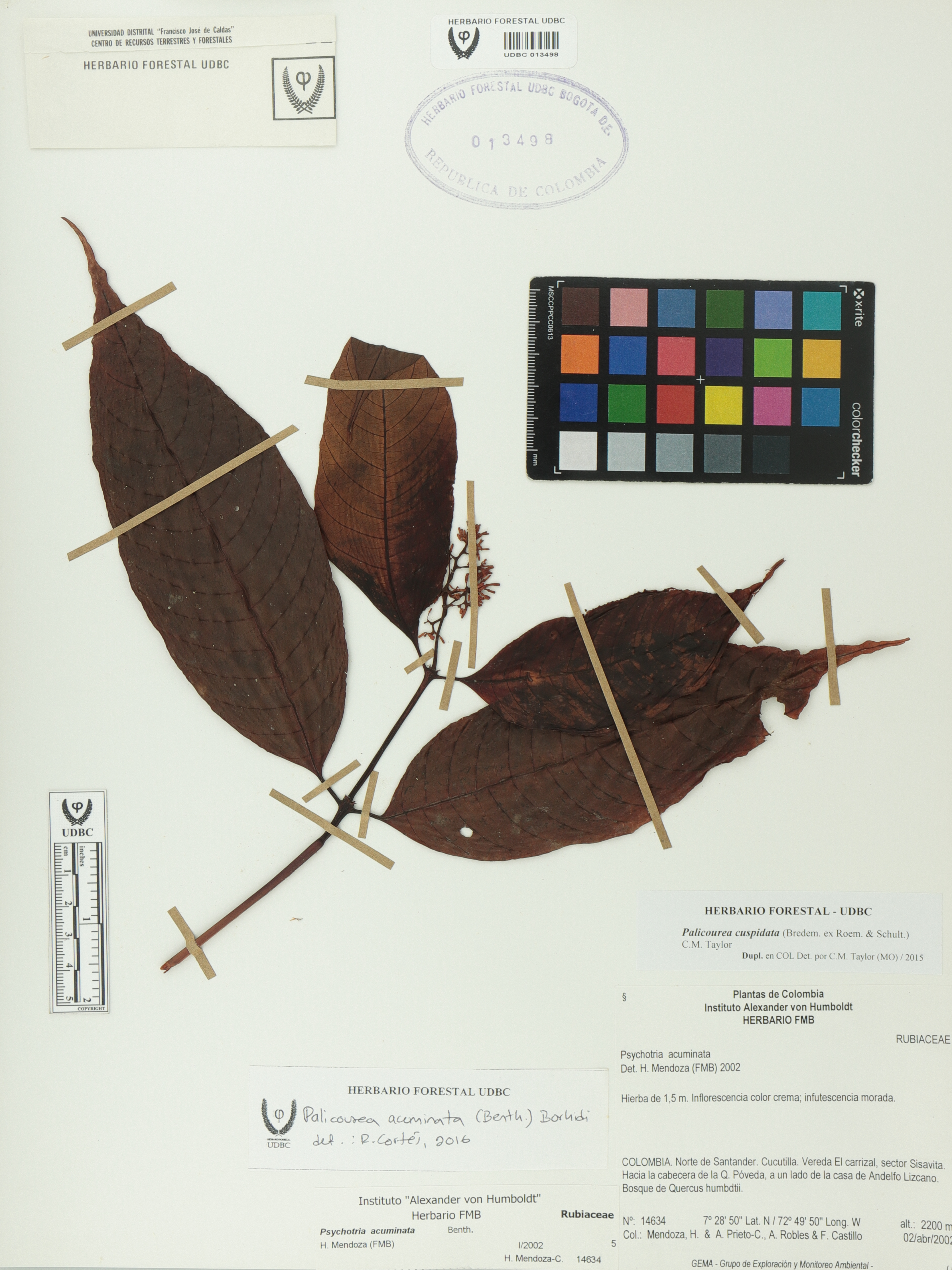 Fotografía del ejemplar Mendoza, H. 14634, determinado como Palicourea cuspidata en el año 2015