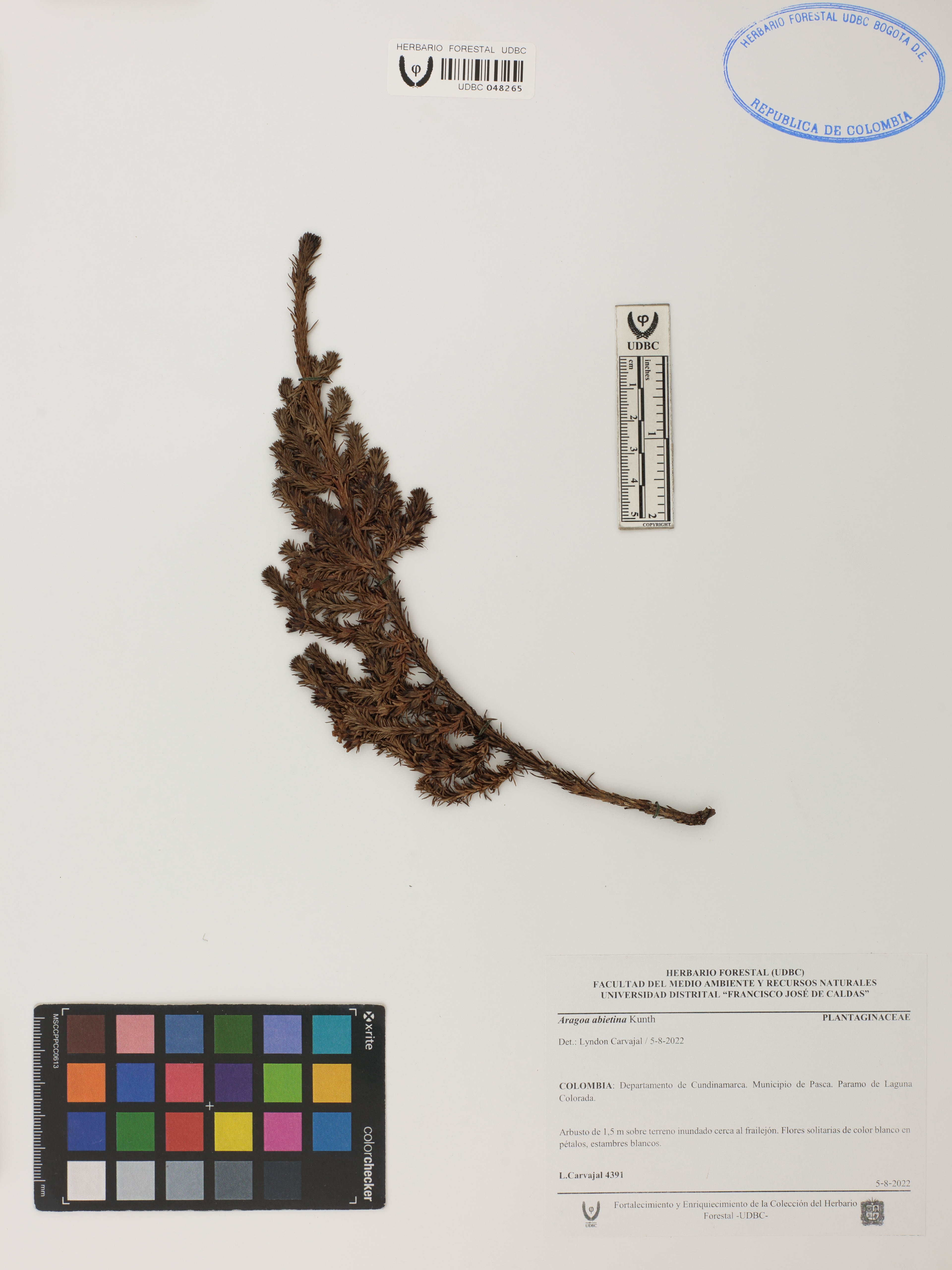 | dc.description | Fotografía del ejemplar Carvajal, L. 4391, determinado como Aragoa abietina en el año 2022 | |