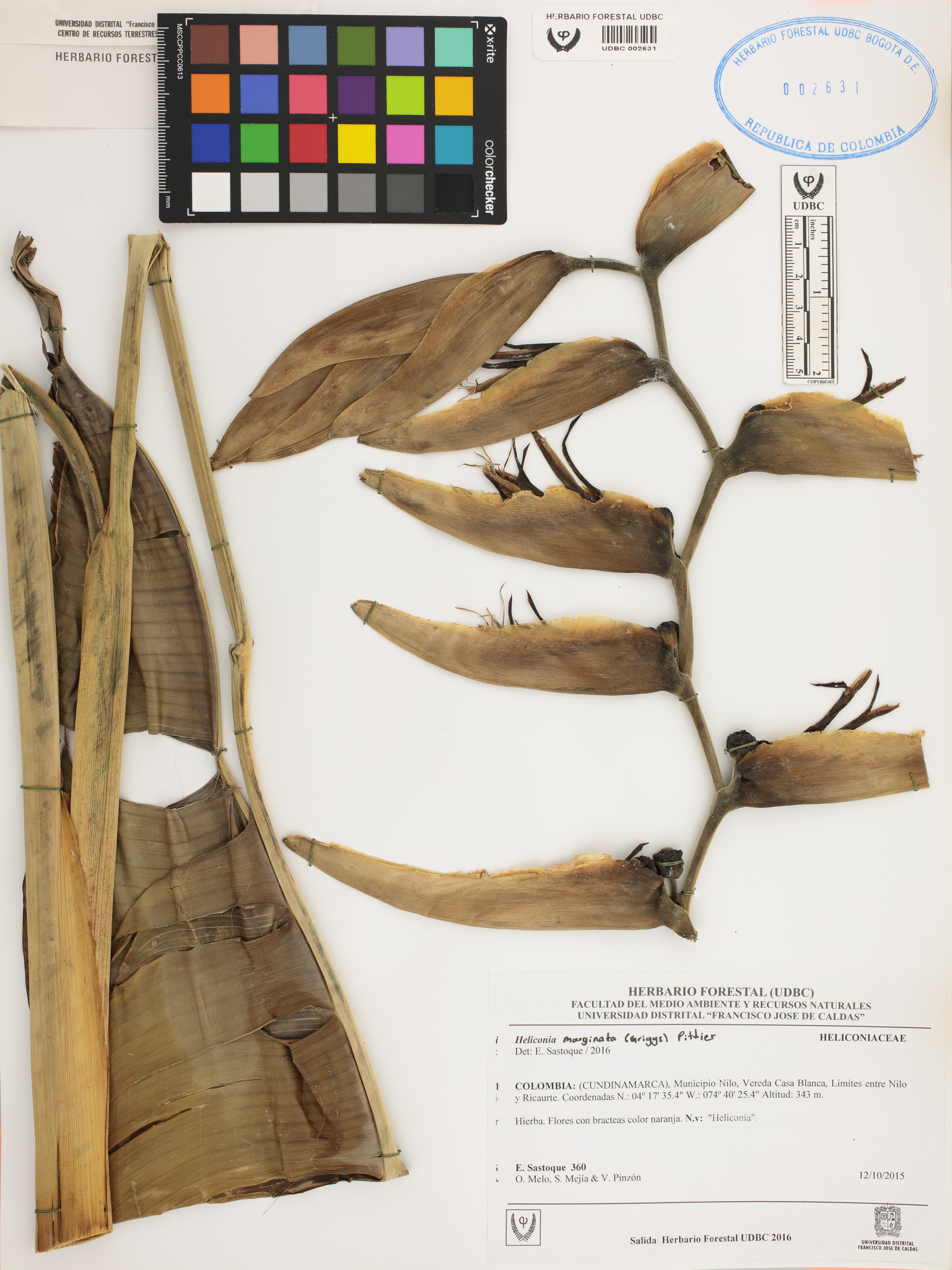 Fotografía del ejemplar Sastoque, E. 360, determinado como Heliconia marginata en el año 2016