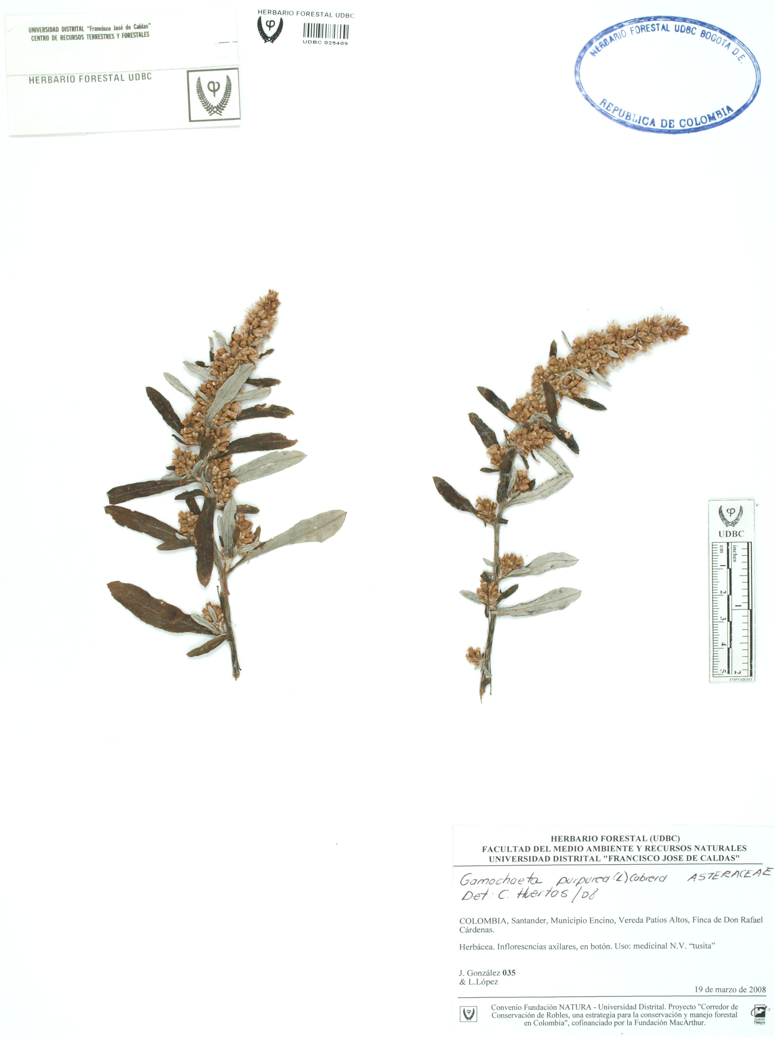 Fotografía del ejemplar González, J. 35, determinado como Gamochaeta purpurea en el año 2008
