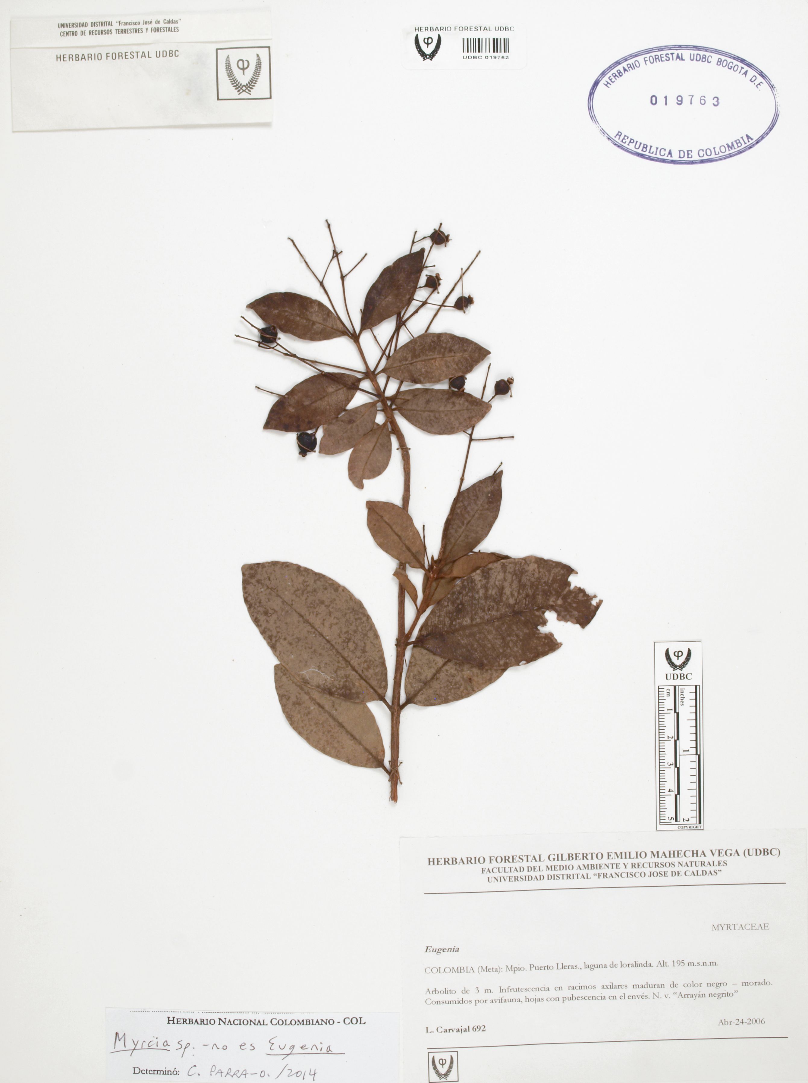 Fotografía del ejemplar Carvajal, L. 692, determinado como Myrcia sp. en el año 2014