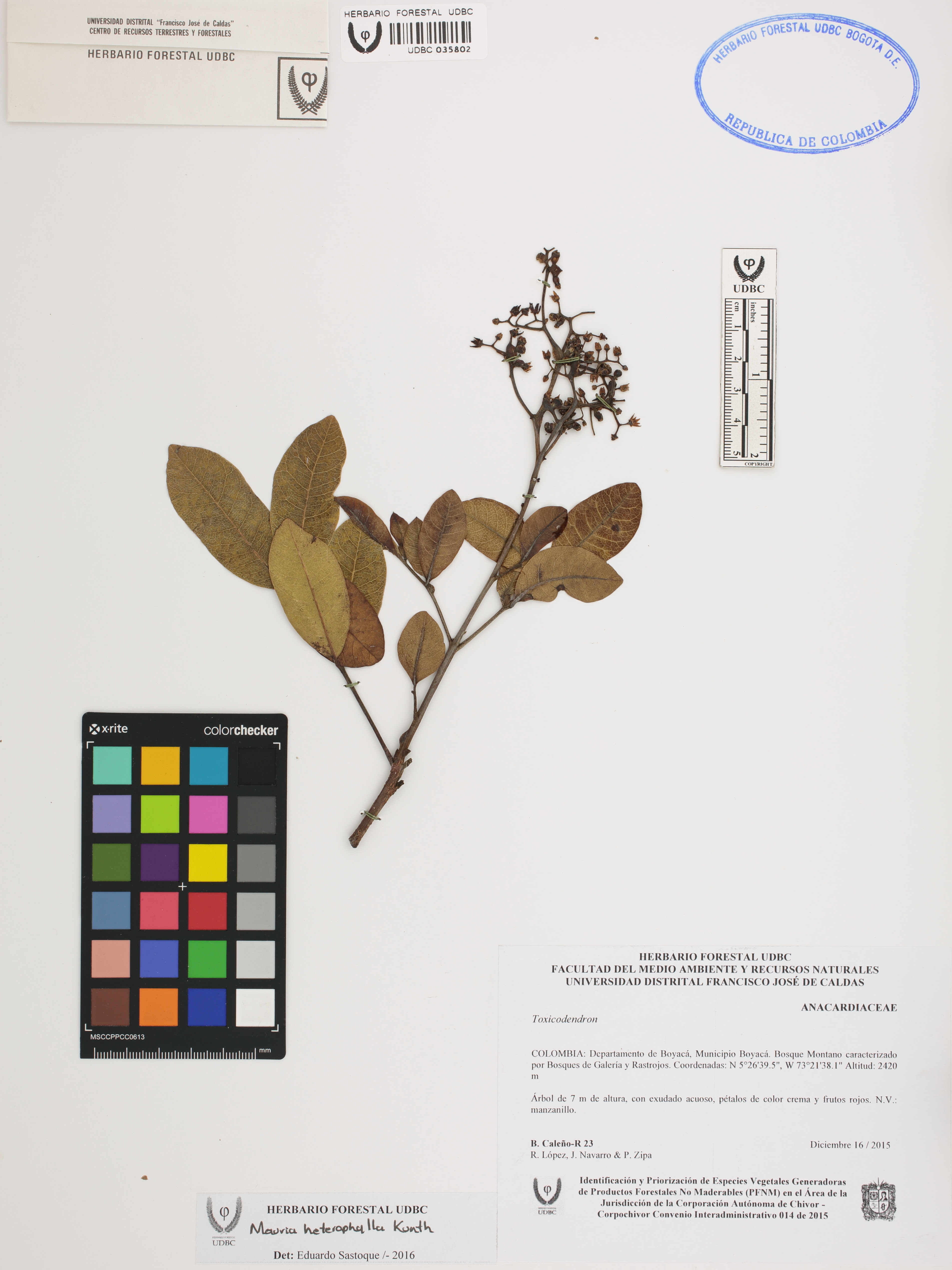 Fotografía del ejemplar Caleño-R., B. 23, determinado como Mauria heterophylla en el año 2016