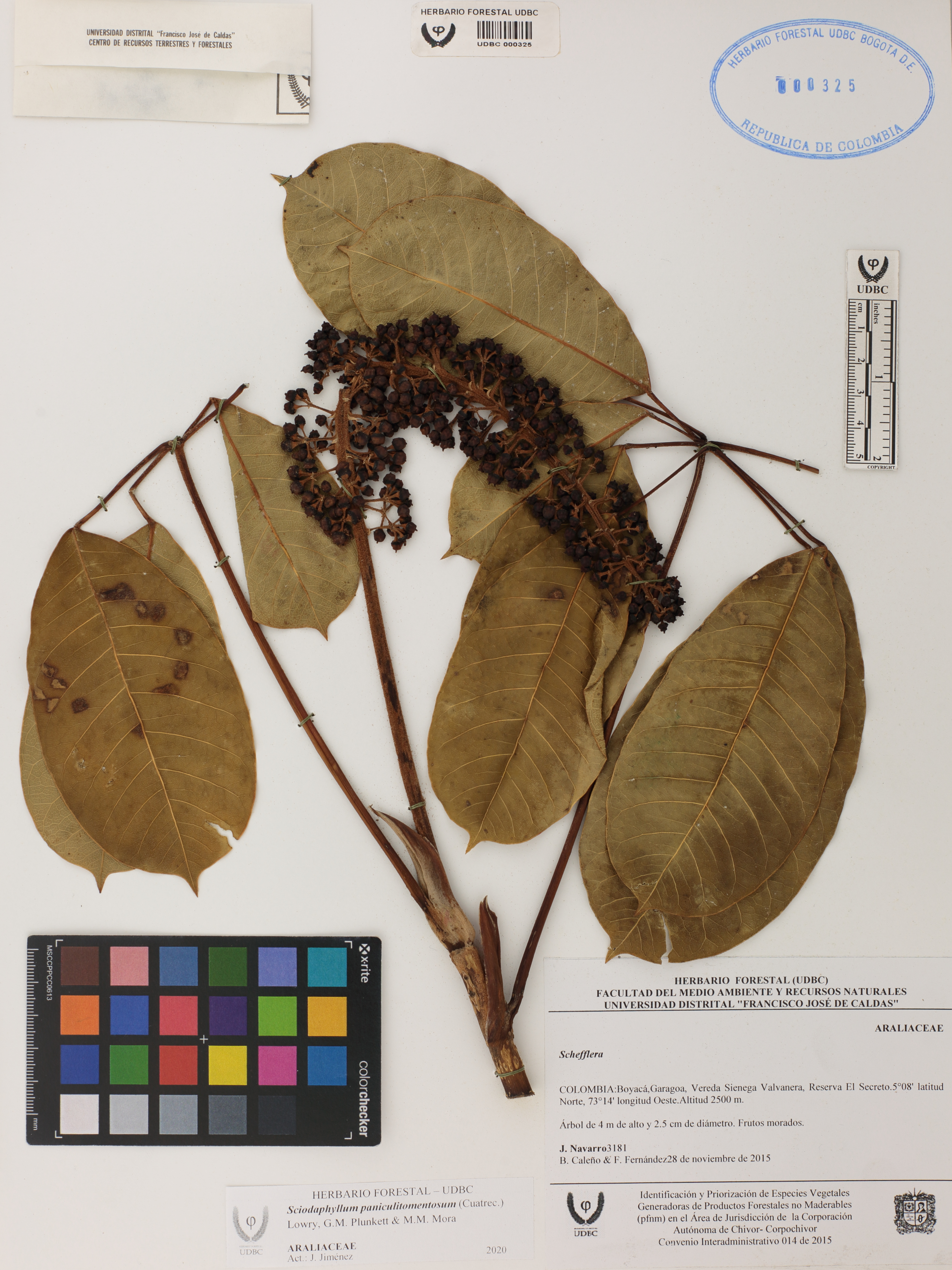 Fotografía del ejemplar Navarro, J. 3181, determinado como Sciodaphyllum paniculitomentosum en el año 2020
