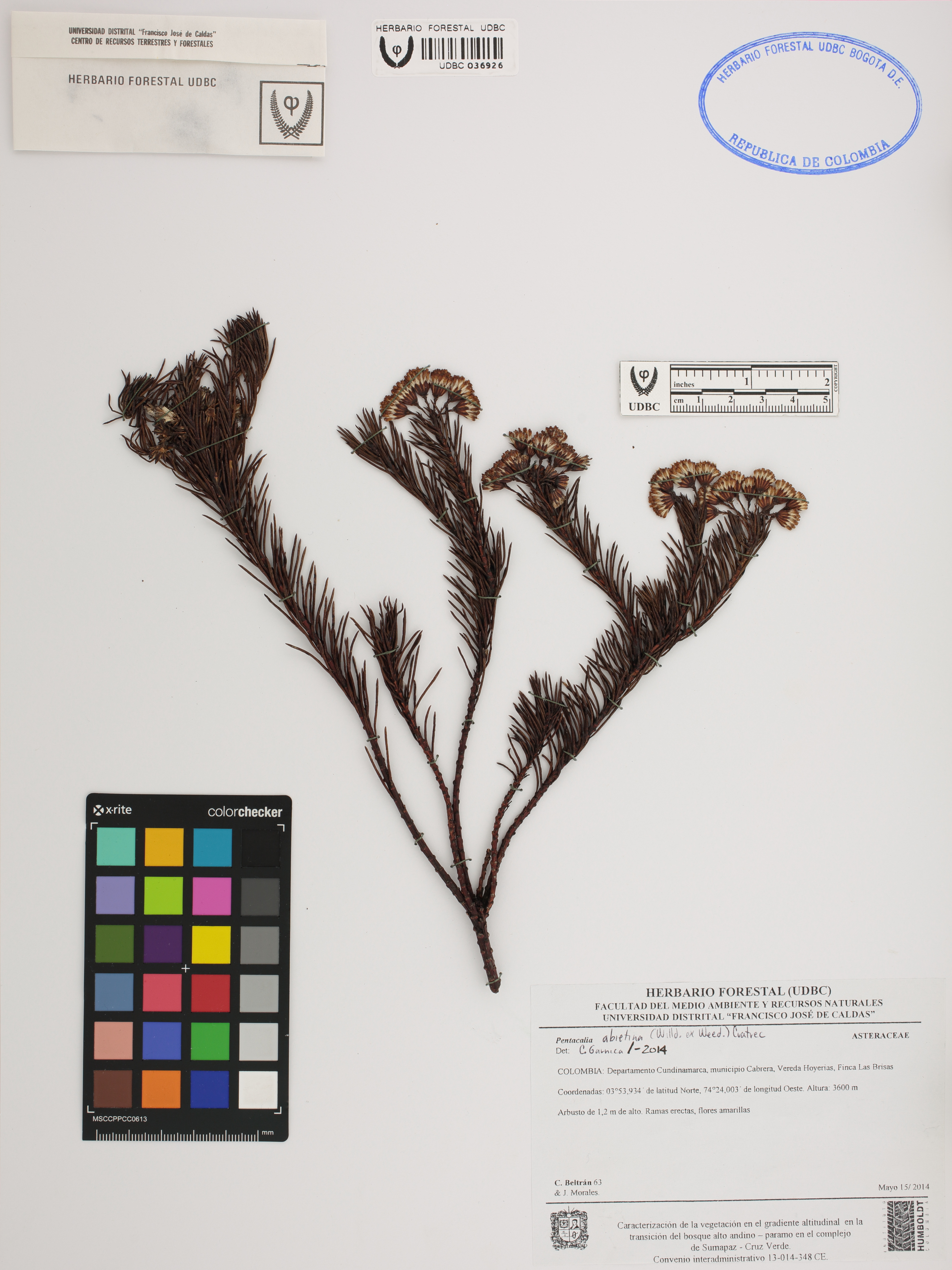 Fotografía del ejemplar Beltrán, C. 63, determinado como Pentacalia abietina en el año 2014