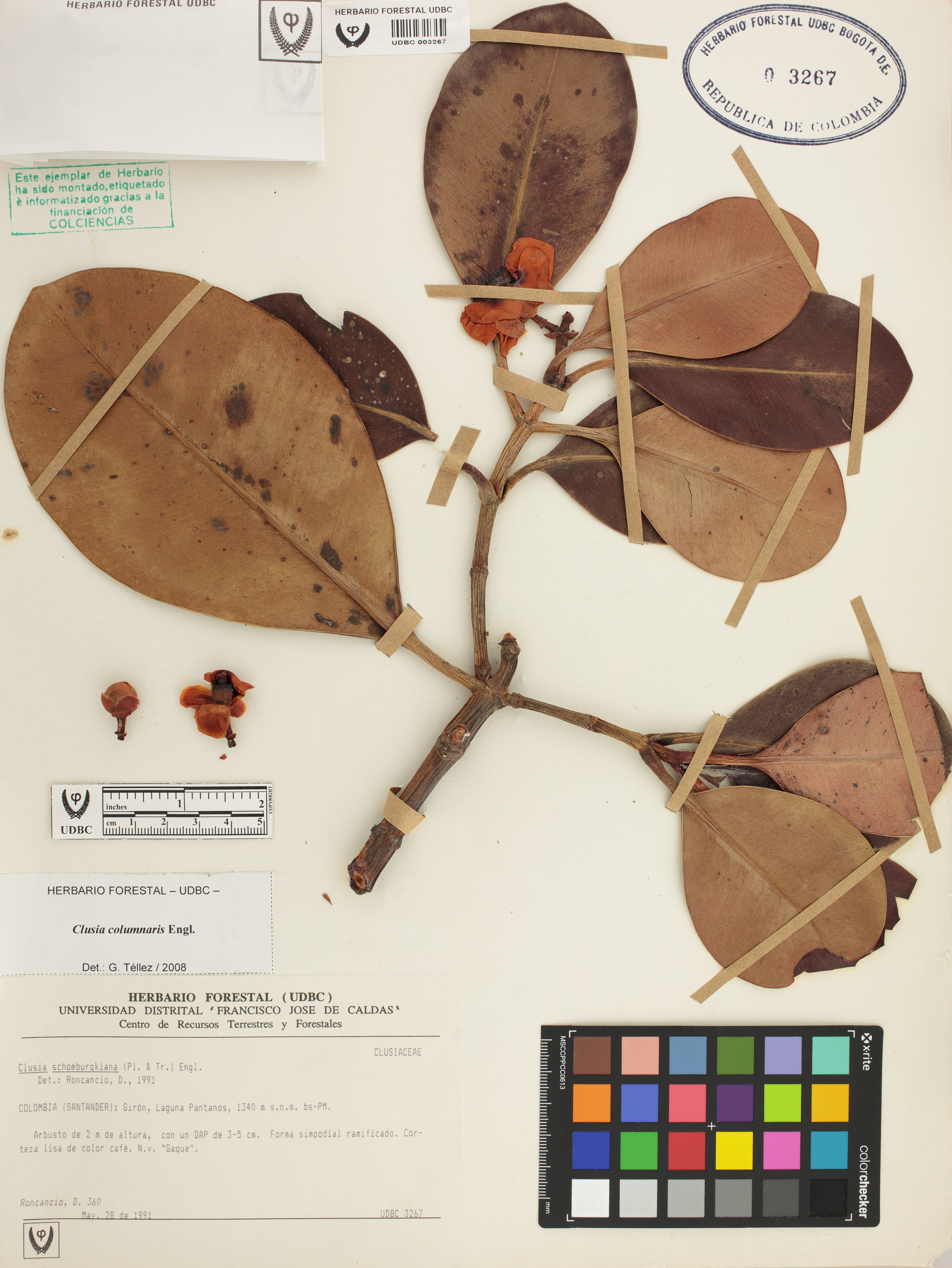 Fotografía del ejemplar Roncancio, D. 360, determinado como Clusia columnaris en el año 2008