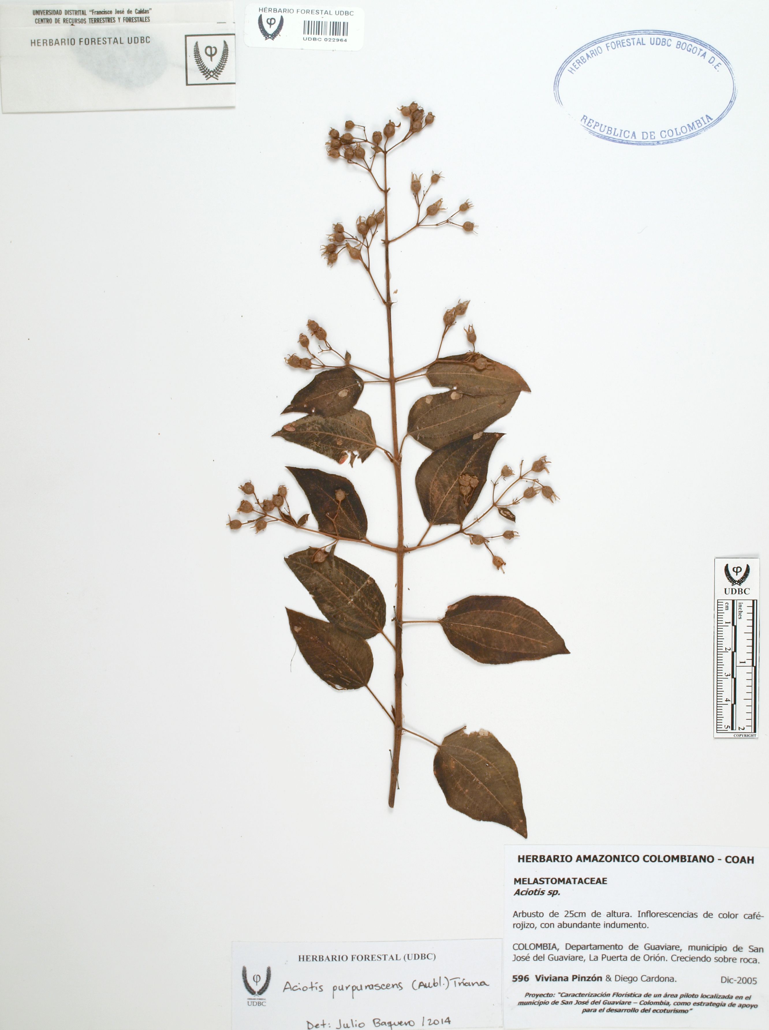 Fotografía del ejemplar Pinzón, V. 596, determinado como Aciotis purpurascens en el año 2014
