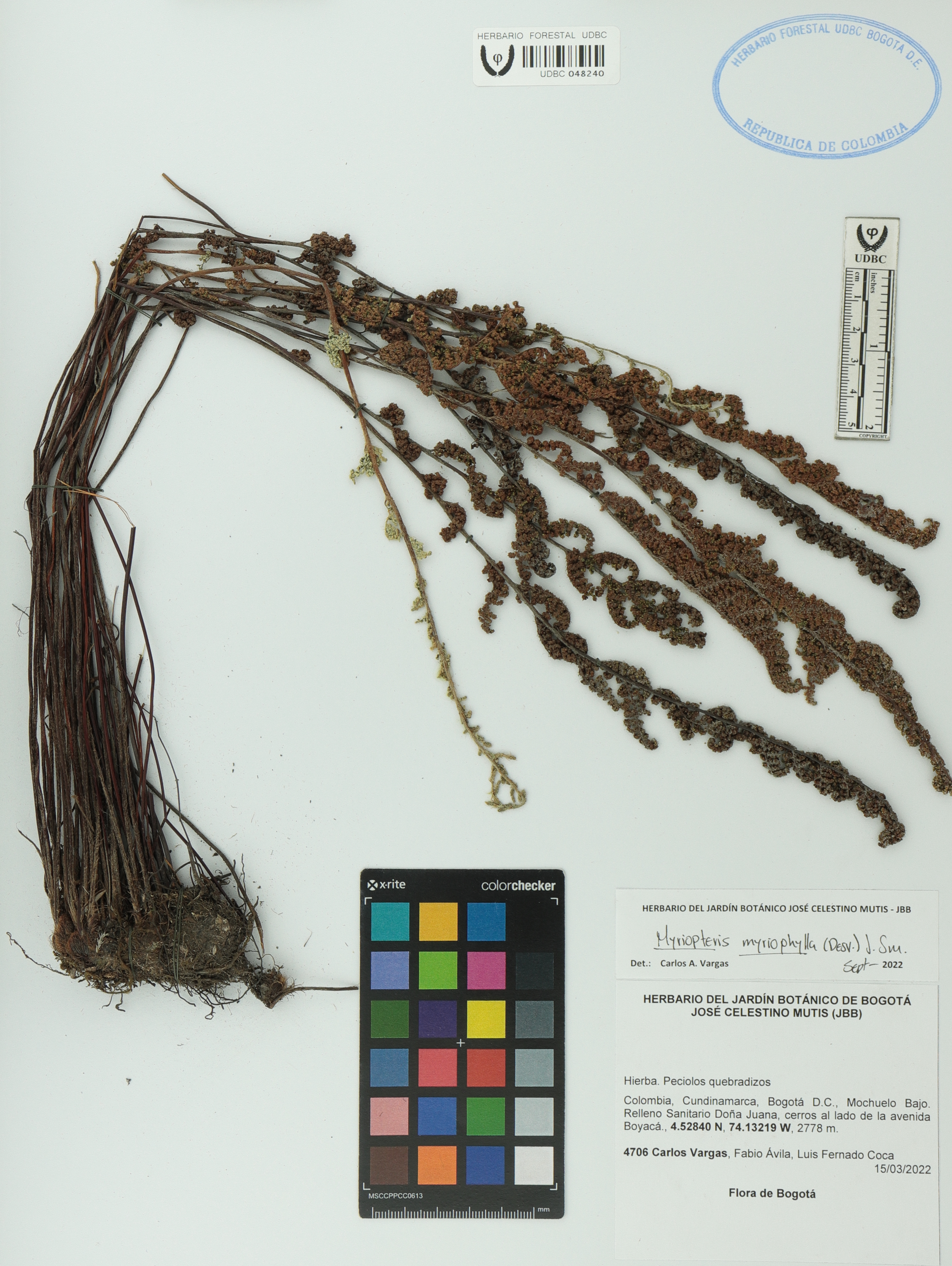 Fotografía del ejemplar Vargas, C. 4706, determinado como Myriopteris myriophylla en el año 2022