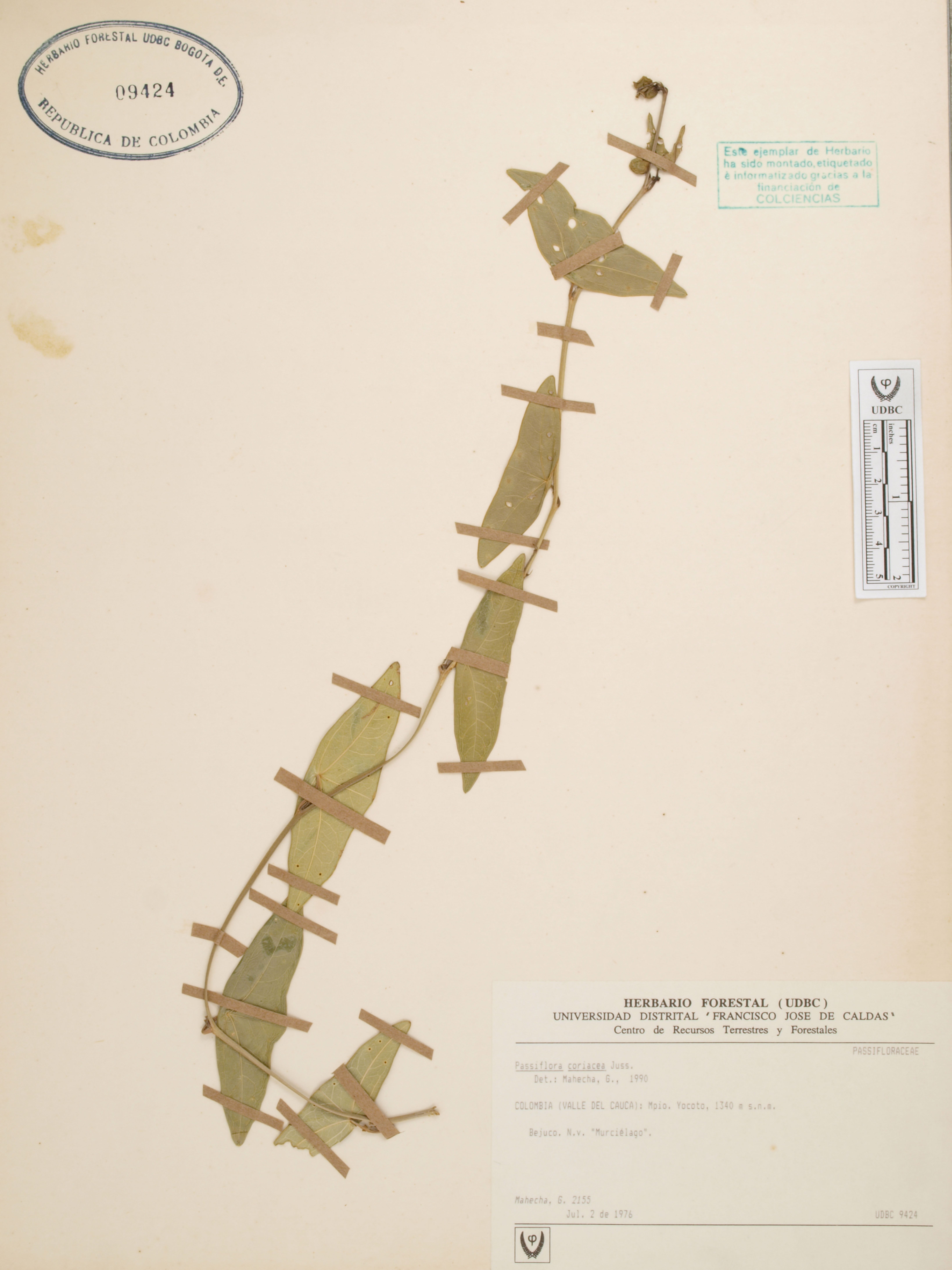 Fotografía del ejemplar Mahecha, G. 2155, determinado como Passiflora coriacea en el año 1990