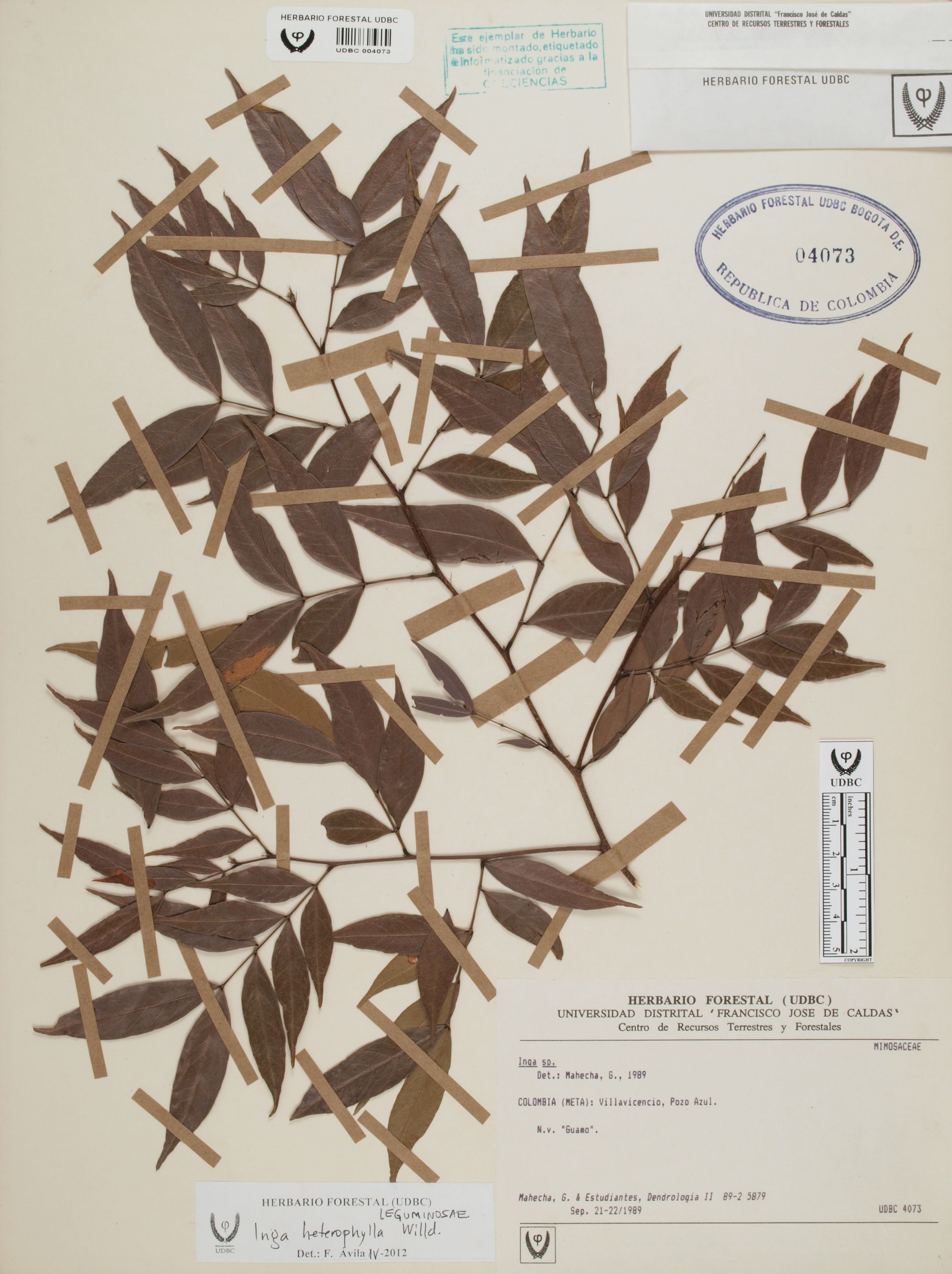 Fotografía del ejemplar Mahecha, G. 5879, determinado como Inga heterophylla en el año 2012