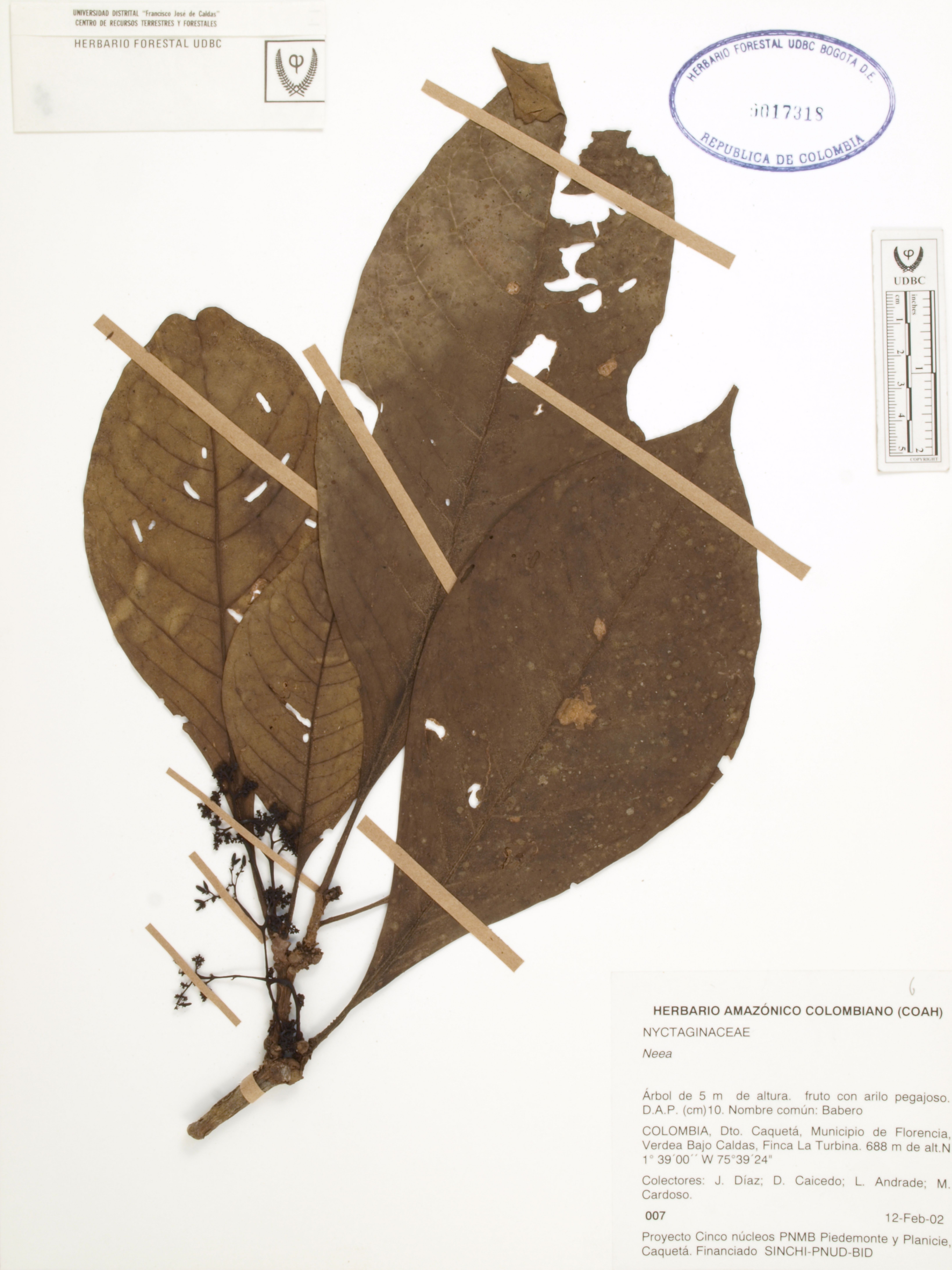 Fotografía del ejemplar Díaz, J. 7, determinado como Neea sp.