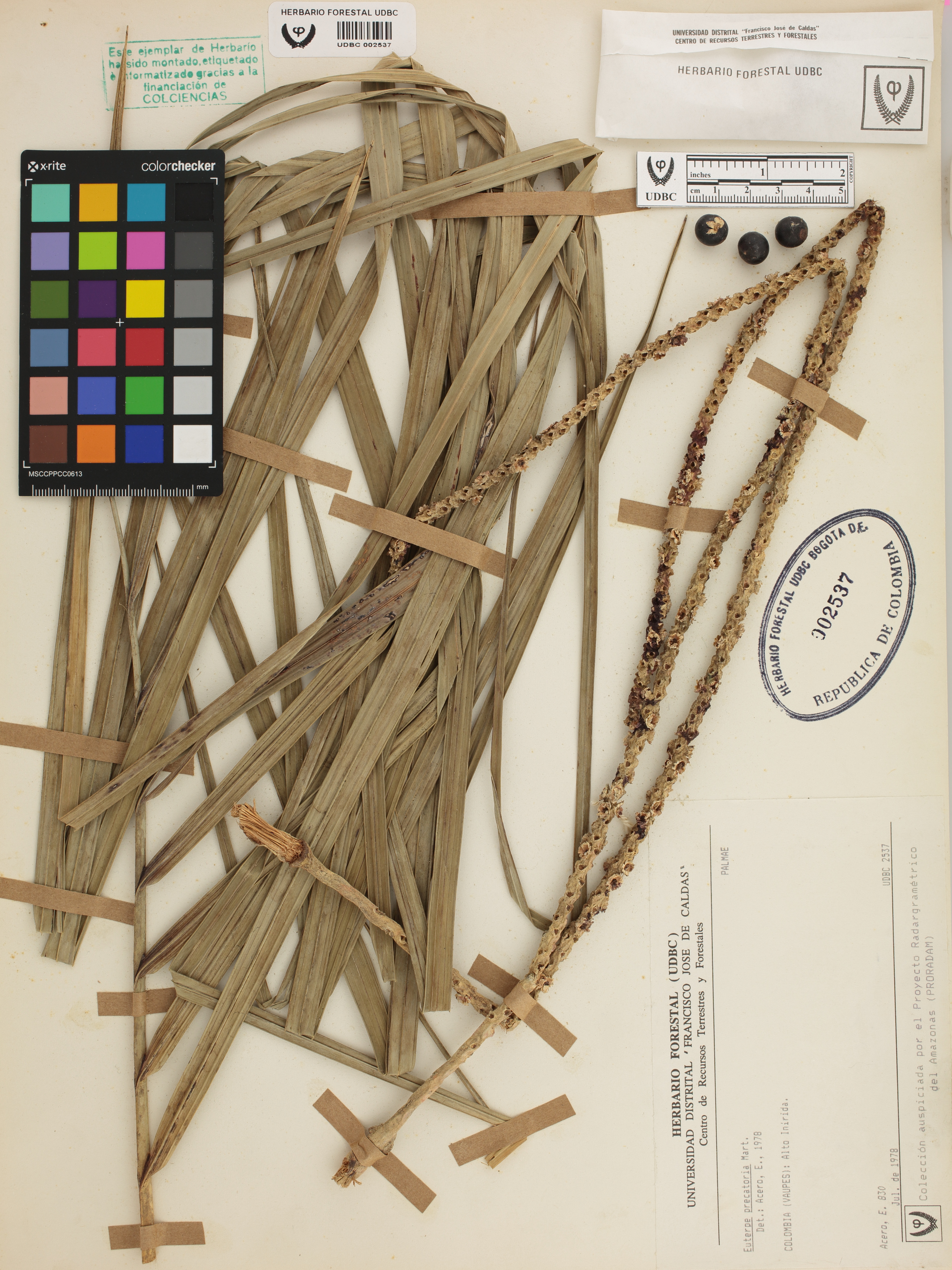 Fotografía del ejemplar Acero, E. 830, determinado como Euterpe precatoria en el año 1978