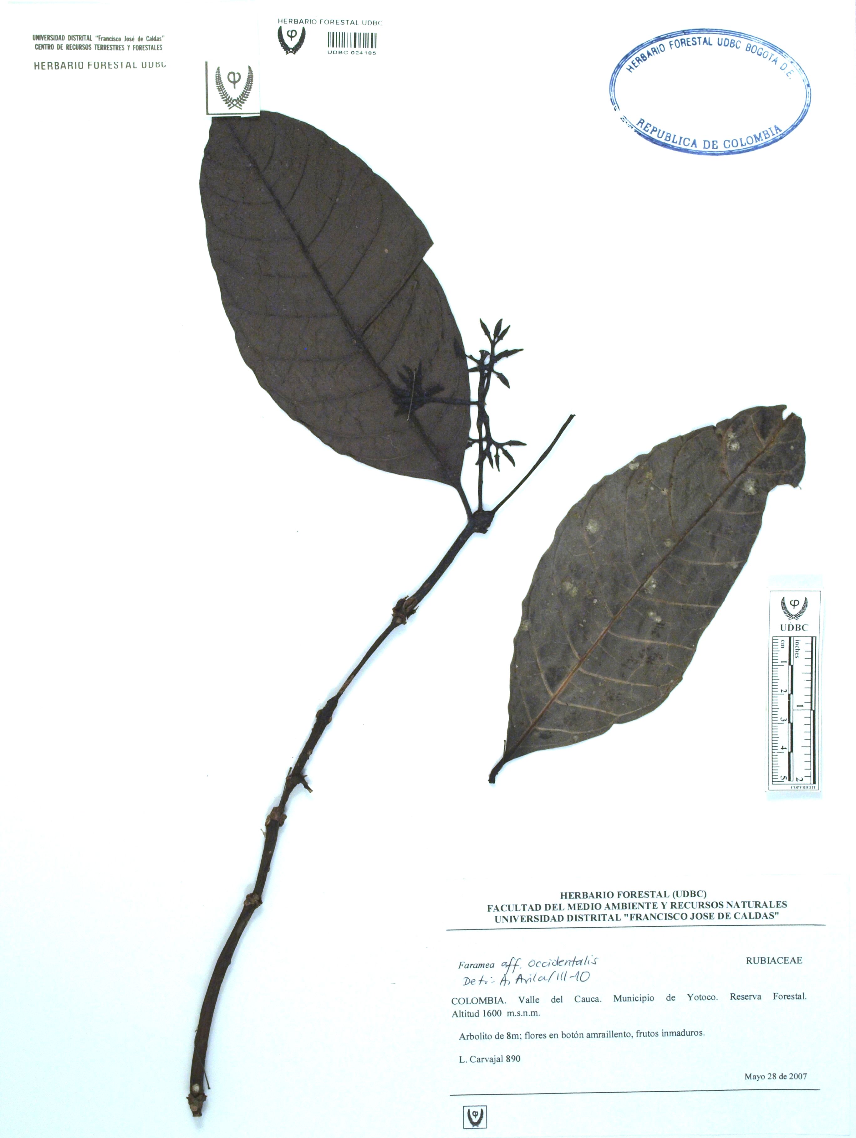 Fotografía del ejemplar Carvajal, L. 890, determinado como Faramea occidentalis en el año 2010