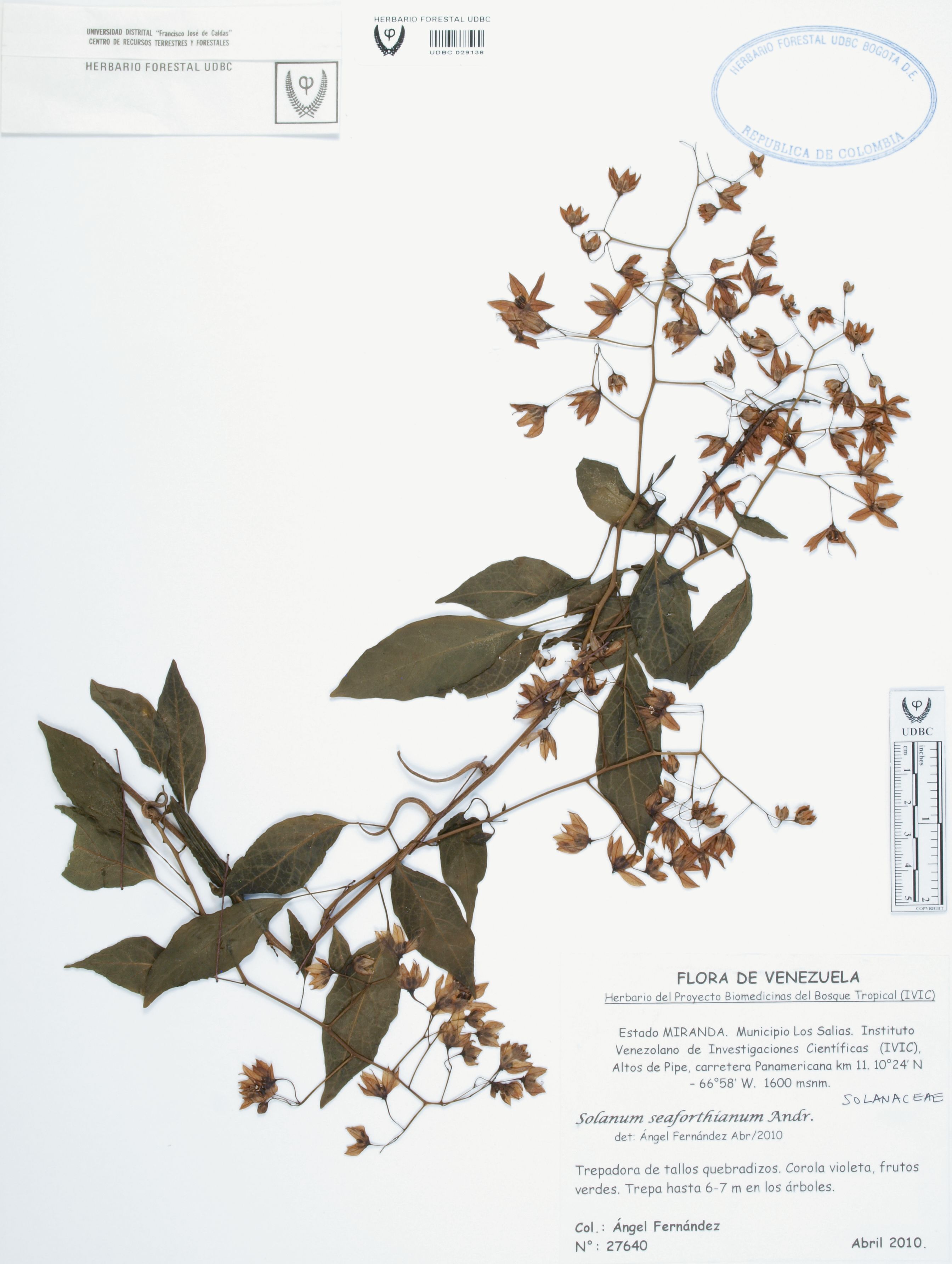 Fotografía del ejemplar Fernández, A. 27640, determinado como Solanum seaforthianum en el año 2010