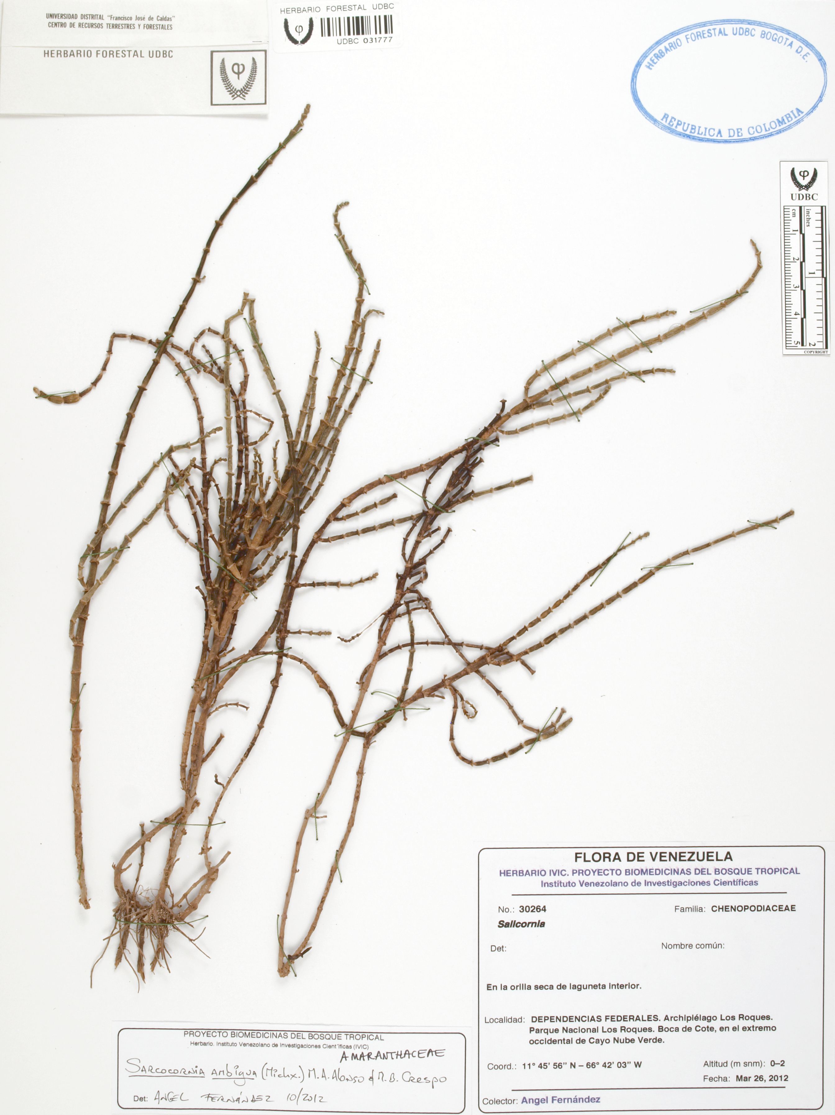 Fotografía del ejemplar Fernández, A. 30264, determinado como Sarcocornia ambigua en el año 2012