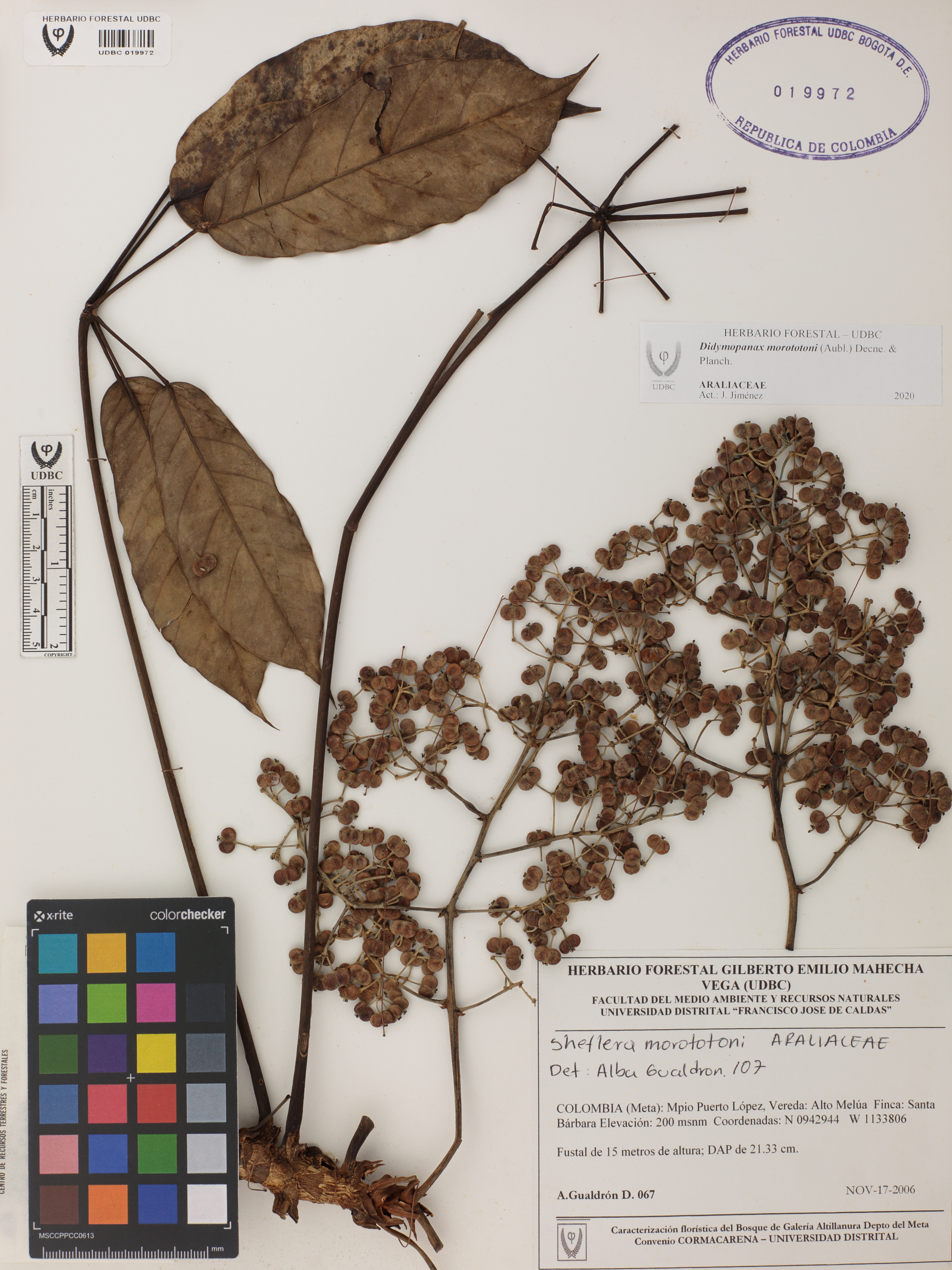 | dc.description | Fotografía del ejemplar Gualdrón, A. 67, determinado como Didymopanax morototoni en el año 2007 | |