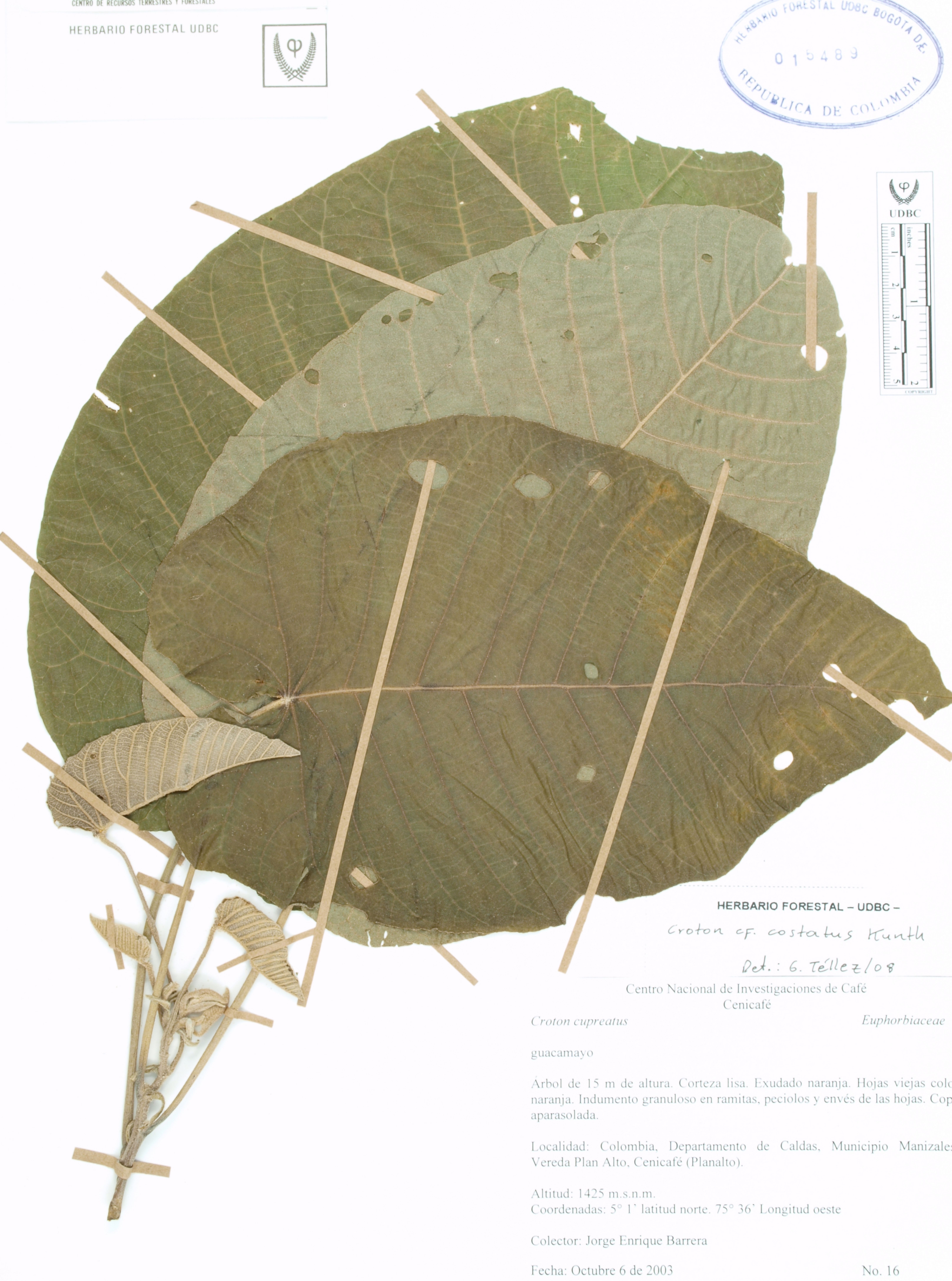 Fotografía del ejemplar Barrera, J. 16, determinado como Croton costatus en el año 2008