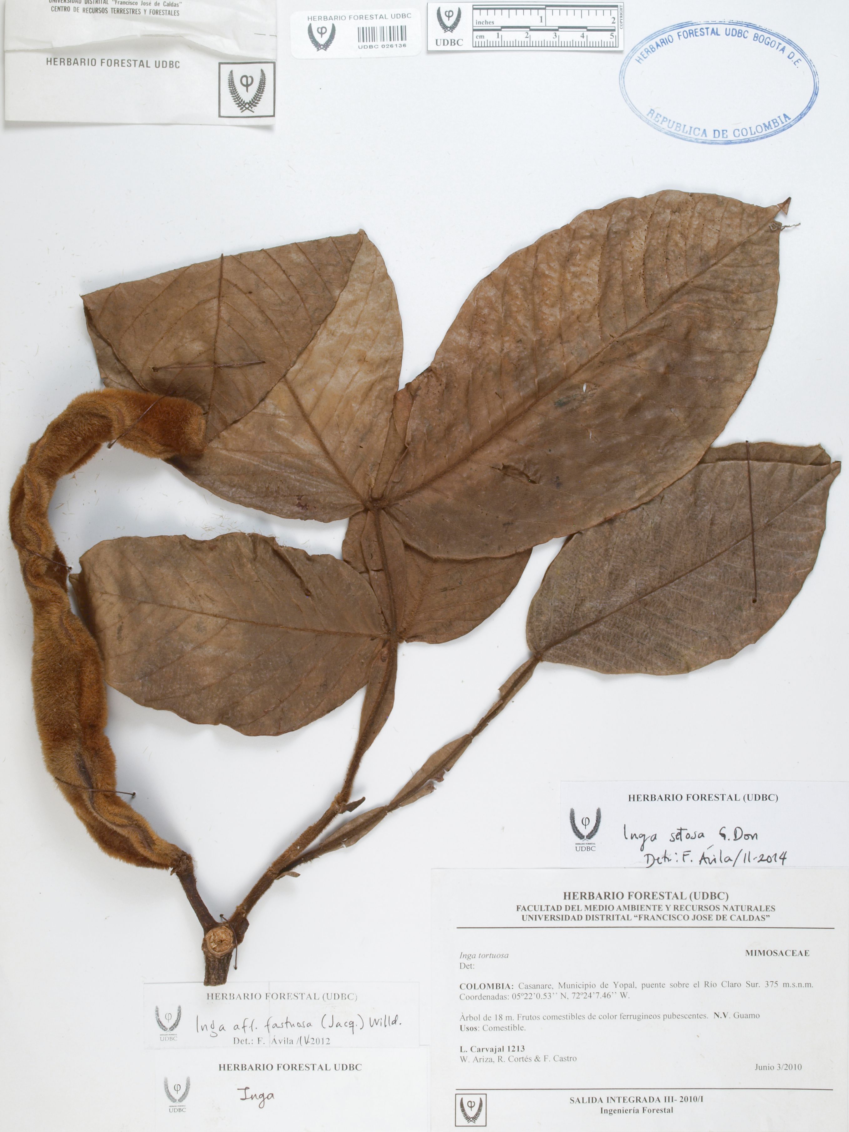 Fotografía del ejemplar Carvajal, L. 1213, determinado como Inga fastuosa en el año 2012