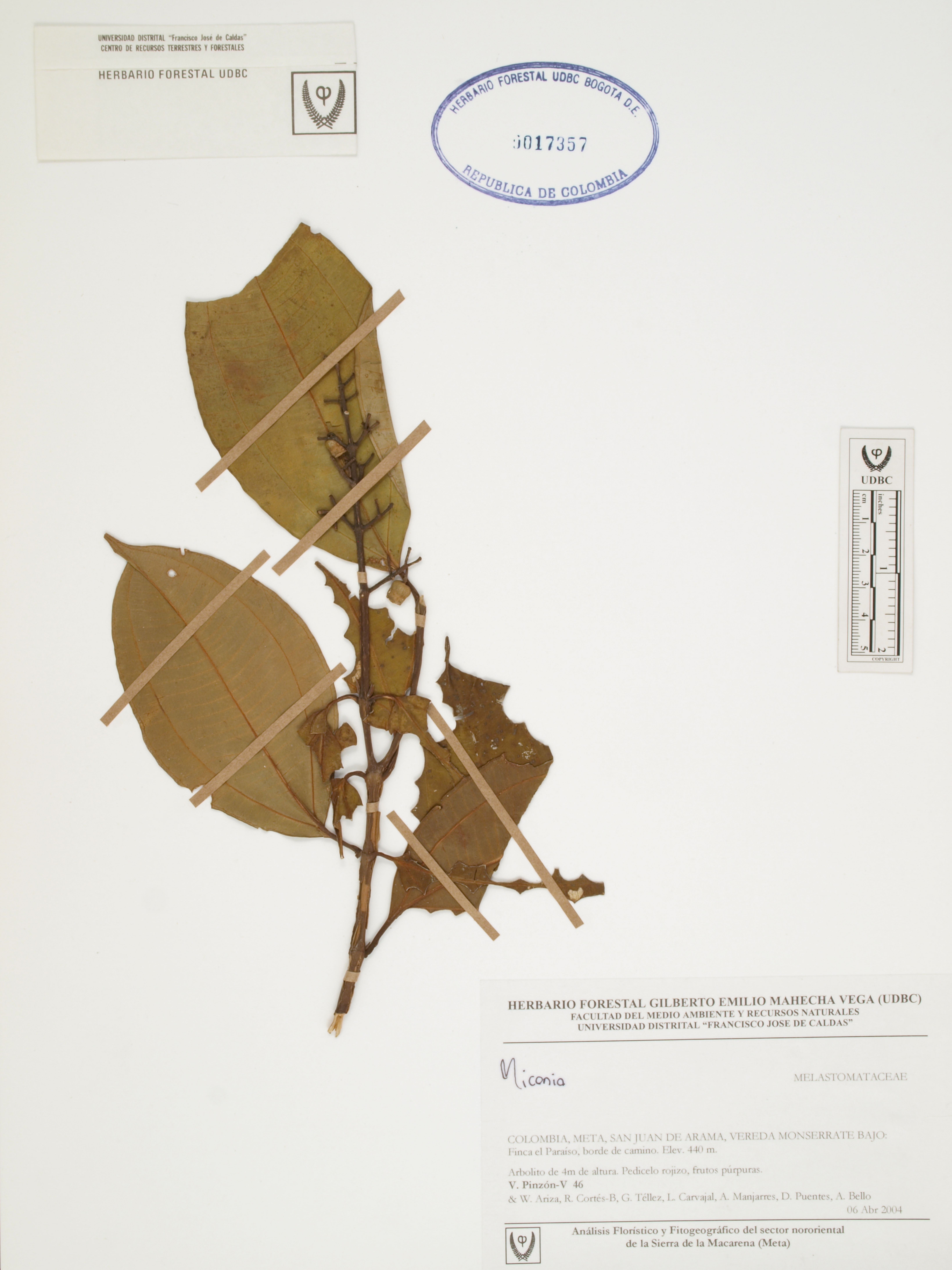Fotografía del ejemplar Pinzón, V. 46, determinado como Miconia sp. en el año 2005