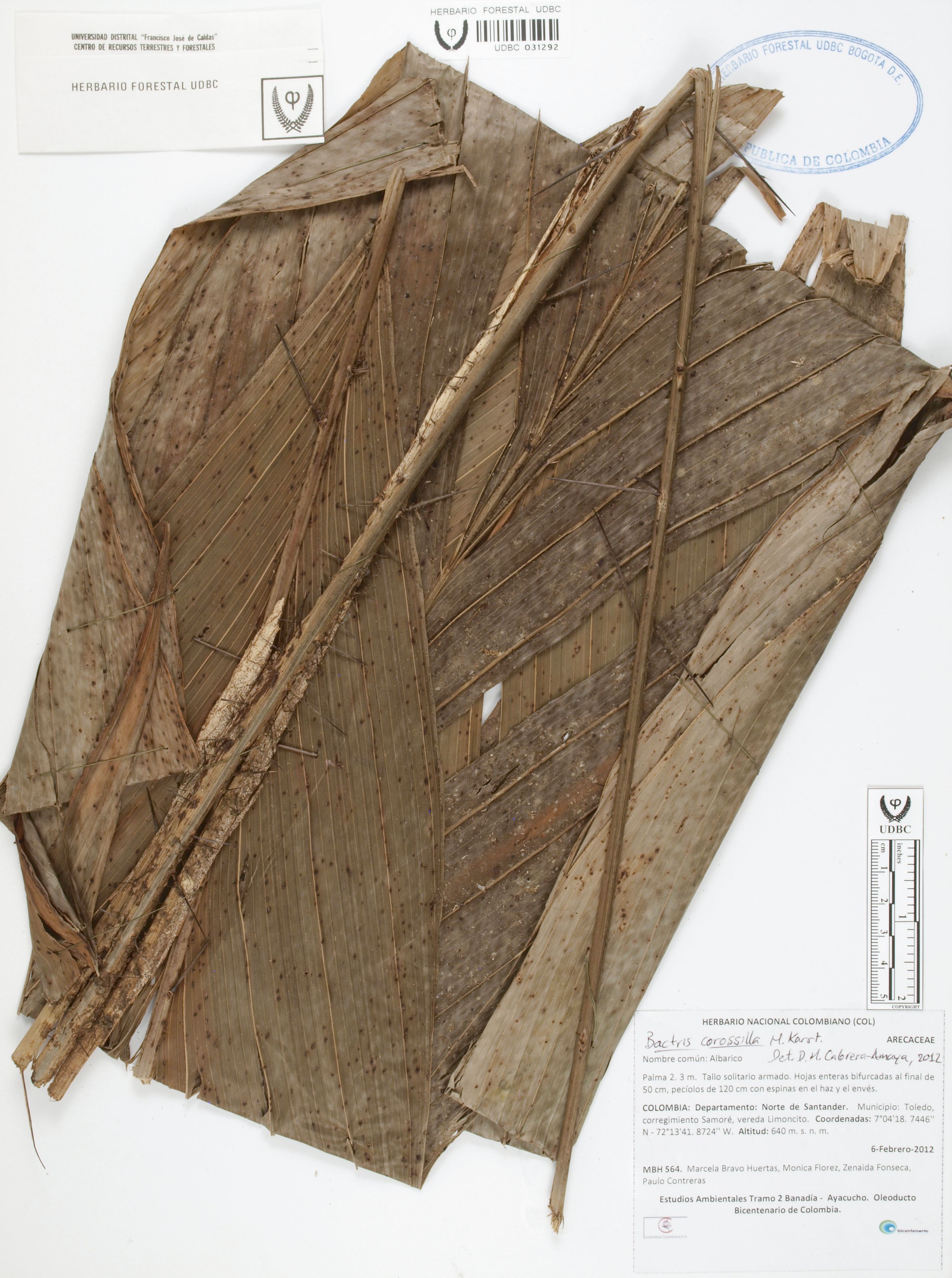 Fotografía del ejemplar Bravo, M. 564, determinado como Bactris corossilla en el año 2012
