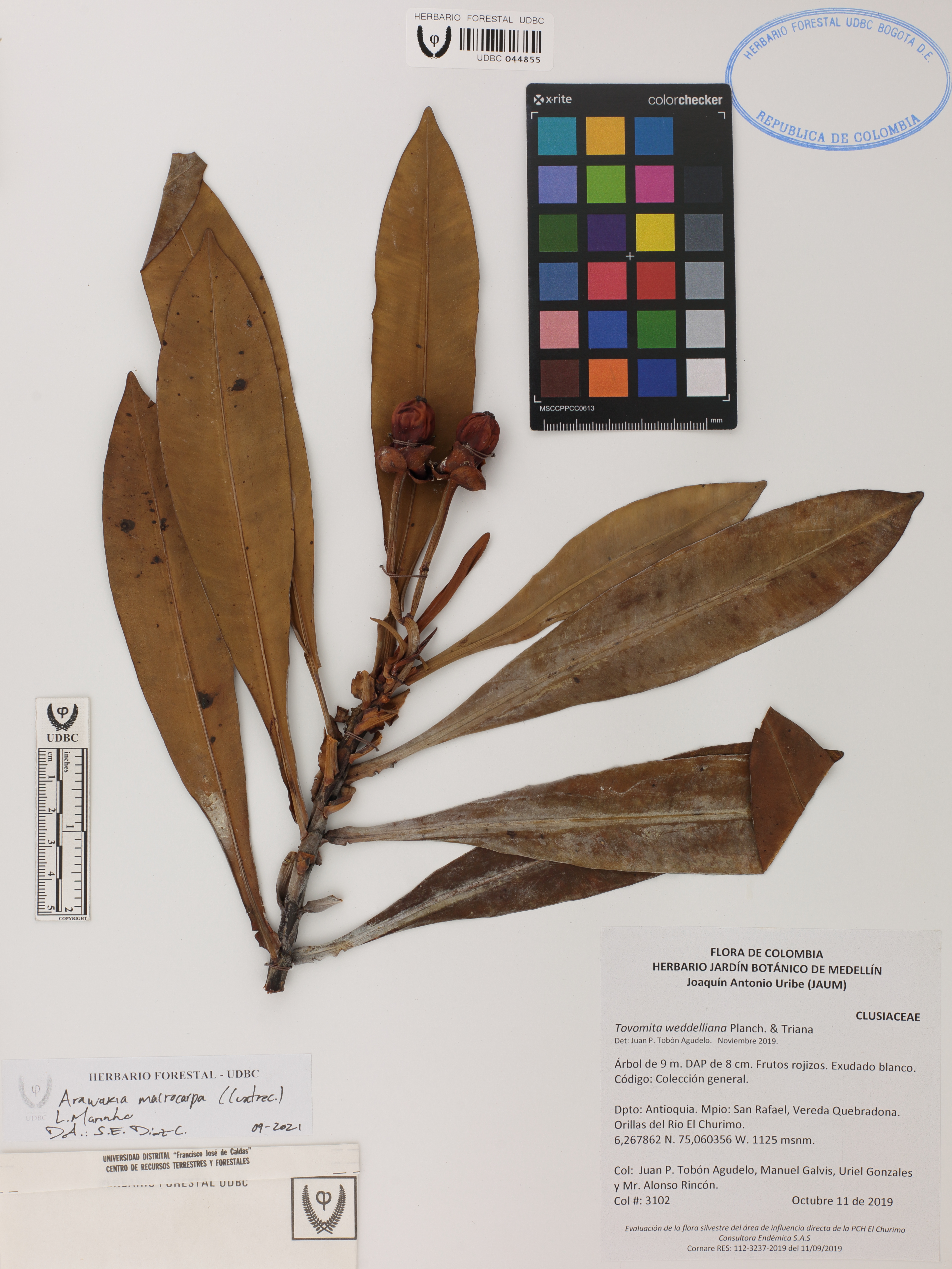 Fotografía del ejemplar Tobón-Agudelo, J. 3102, determinado como Arawakia macrocarpa en el año 2021