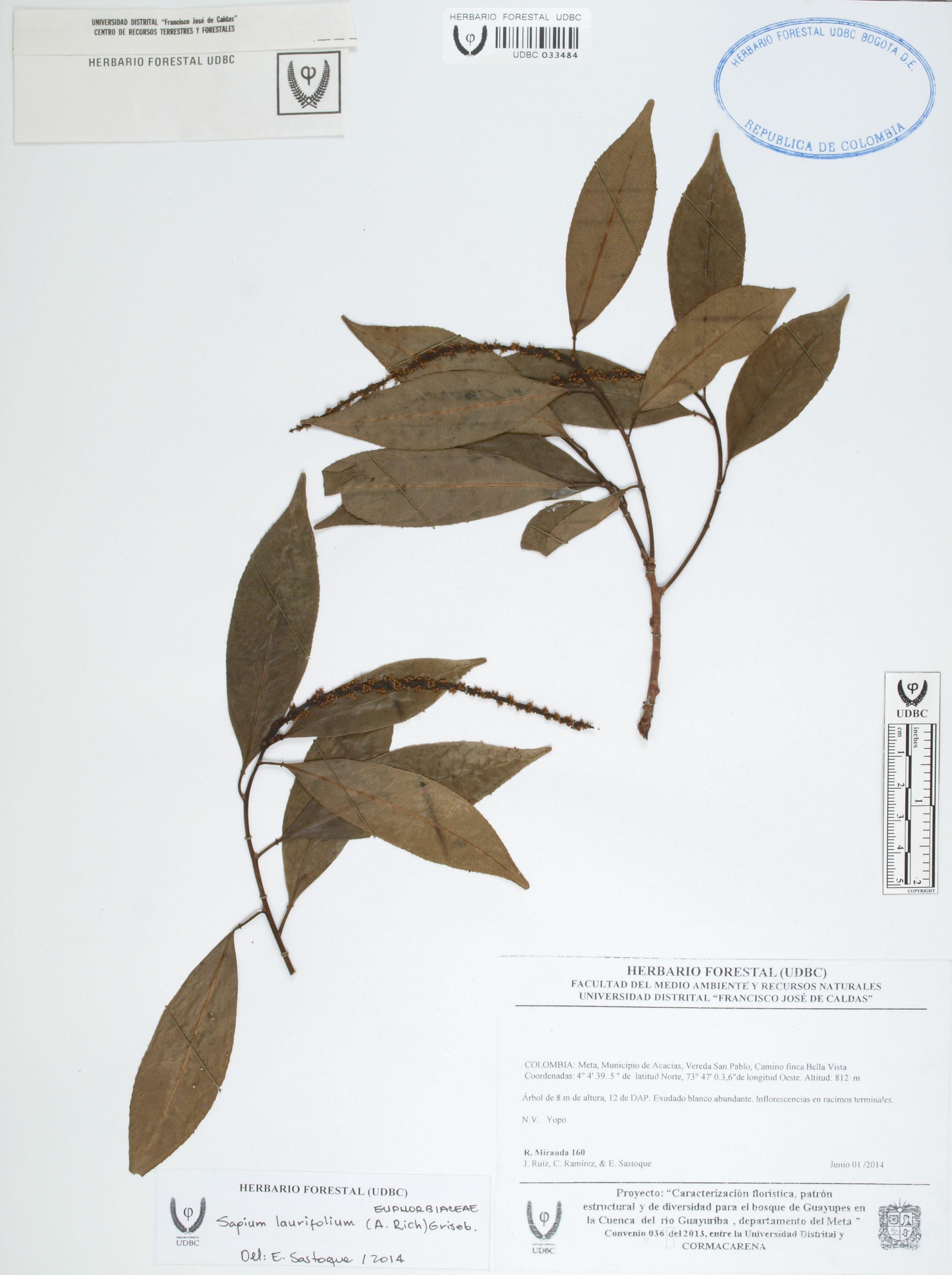 Fotografía del ejemplar Miranda, R. 160, determinado como Sapium laurifolium en el año 2014