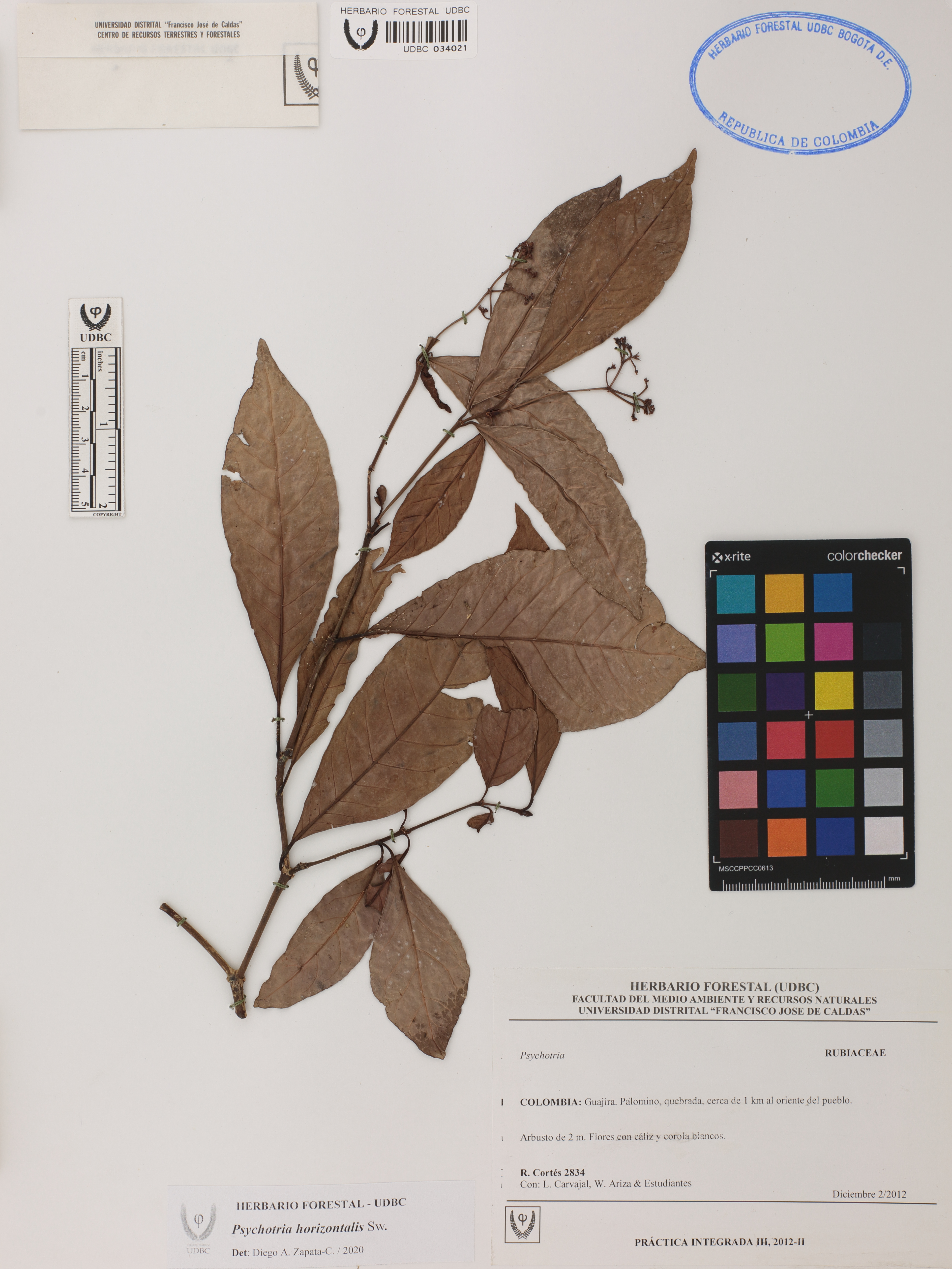 Fotografía del ejemplar Cortés, R. 2834, determinado como Psychotria horizontalis en el año 2020