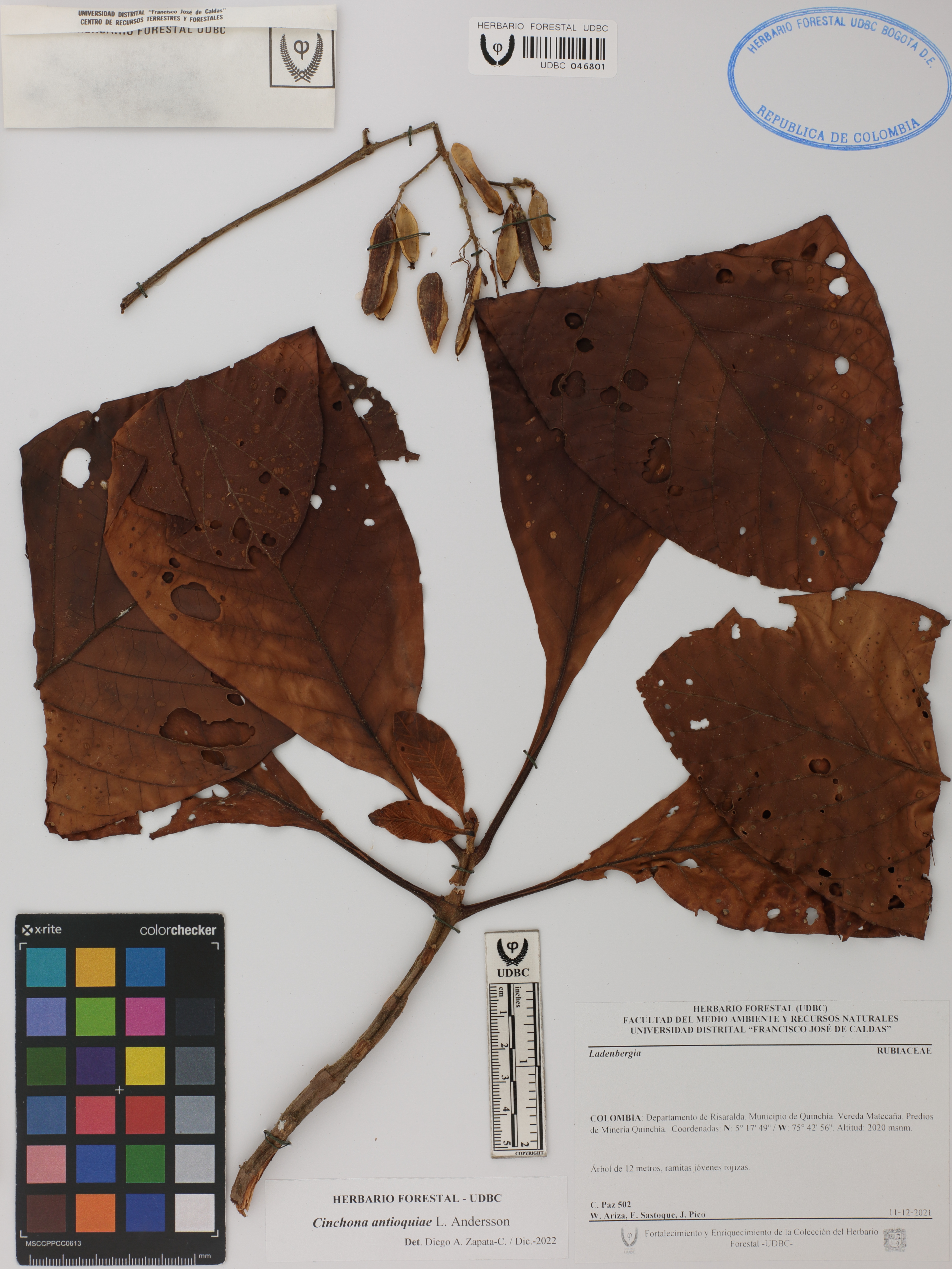 Fotografía del ejemplar Paz, C. 502, determinado como Cinchona antioquiae en el año 2022