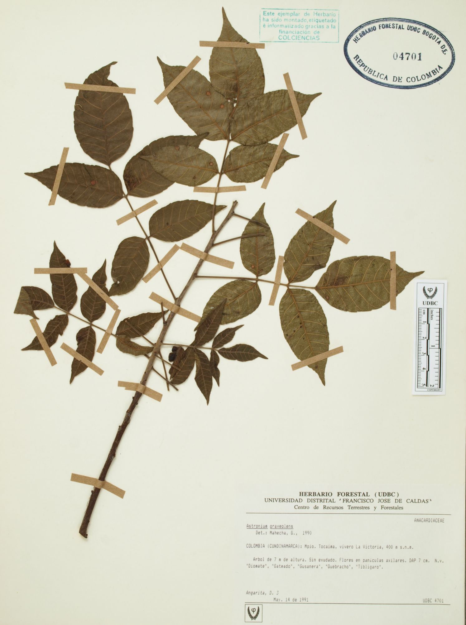 Fotografía del ejemplar Angarita, D. 3, determinado como Astronium graveolens