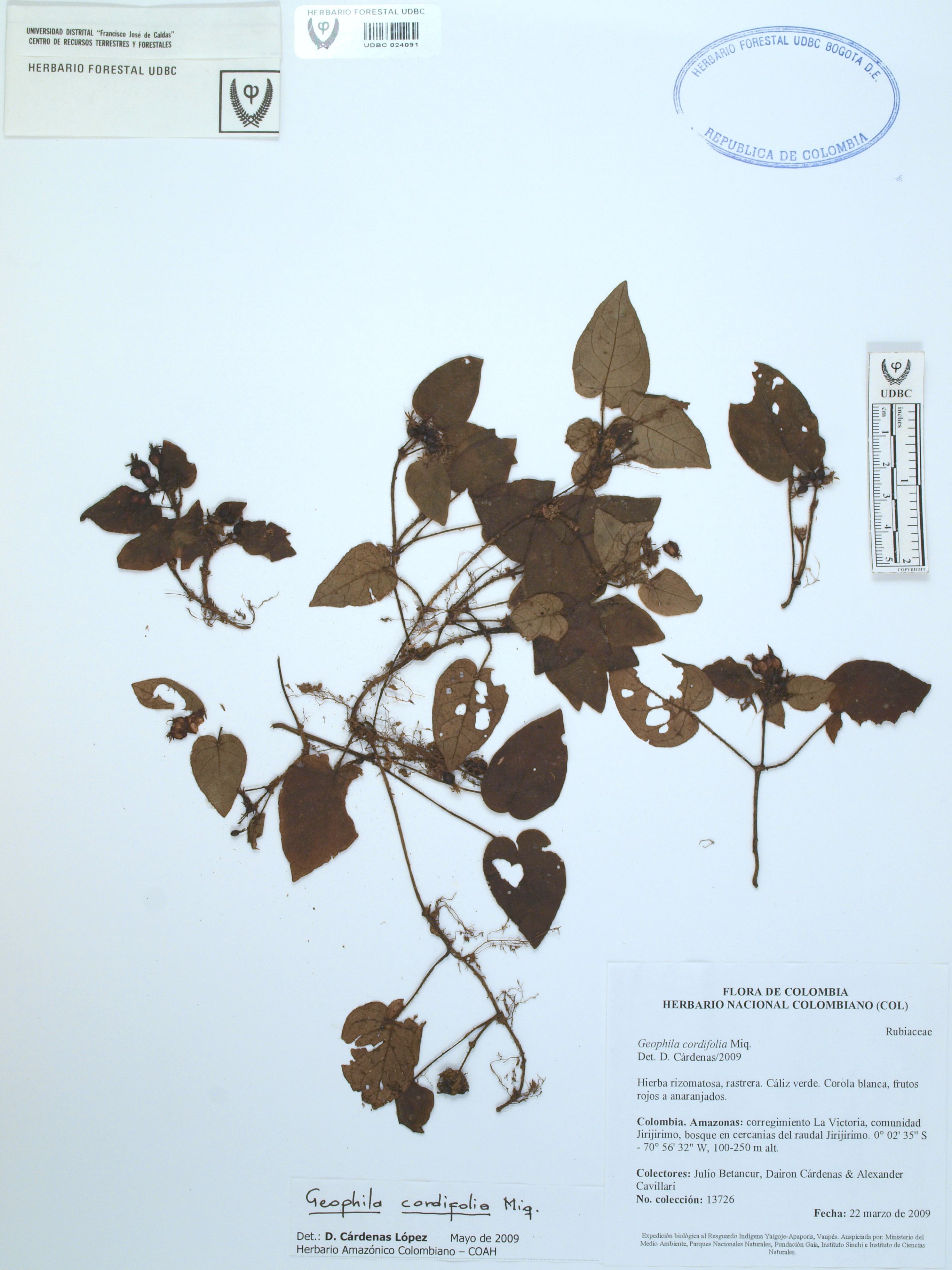 Fotografía del ejemplar Betancur, J. 13726, determinado como Geophila cordifolia en el año 2009