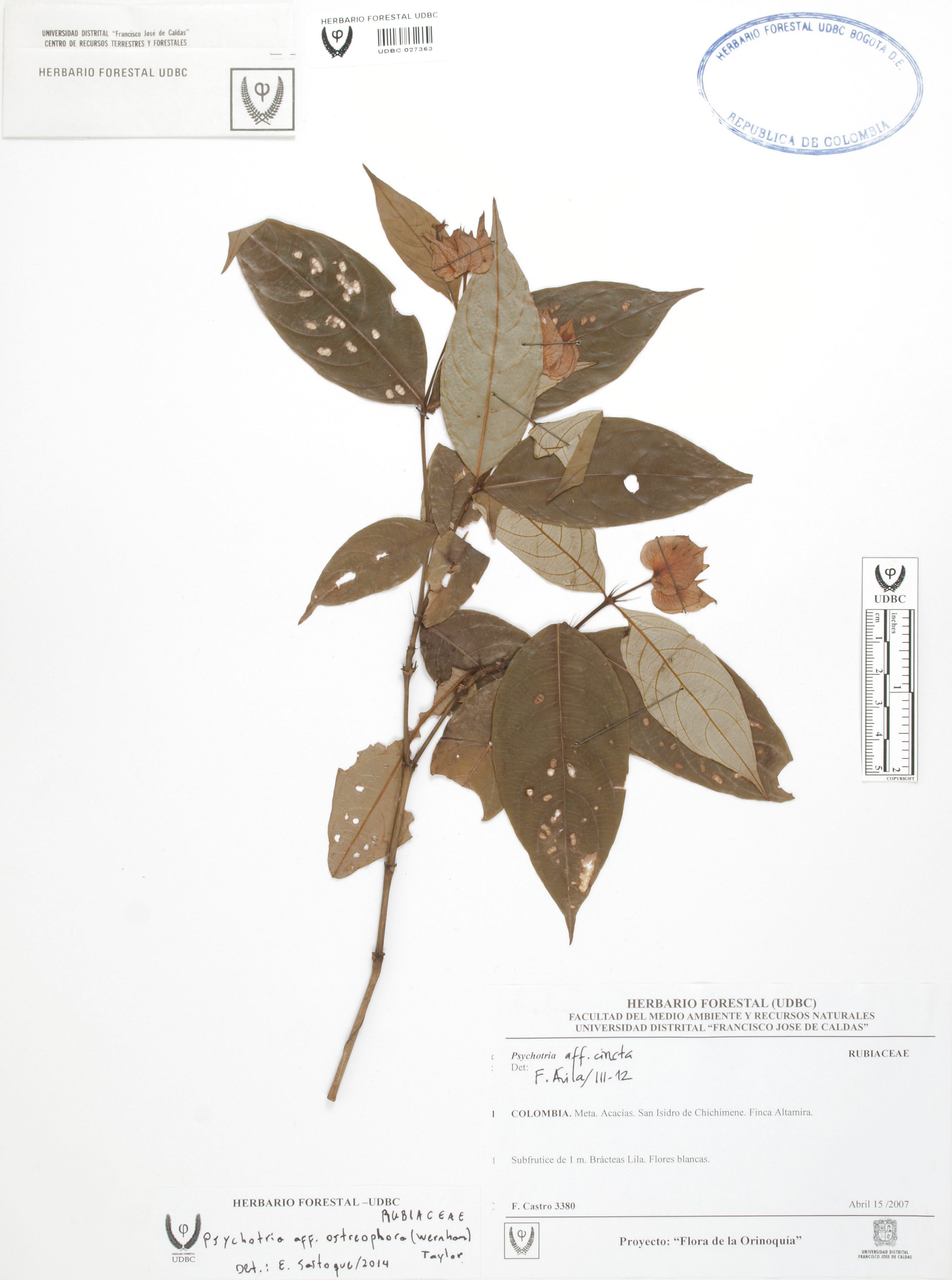 Fotografía del ejemplar Castro, F. 3380, determinado como Psychotria ostreophora en el año 2014