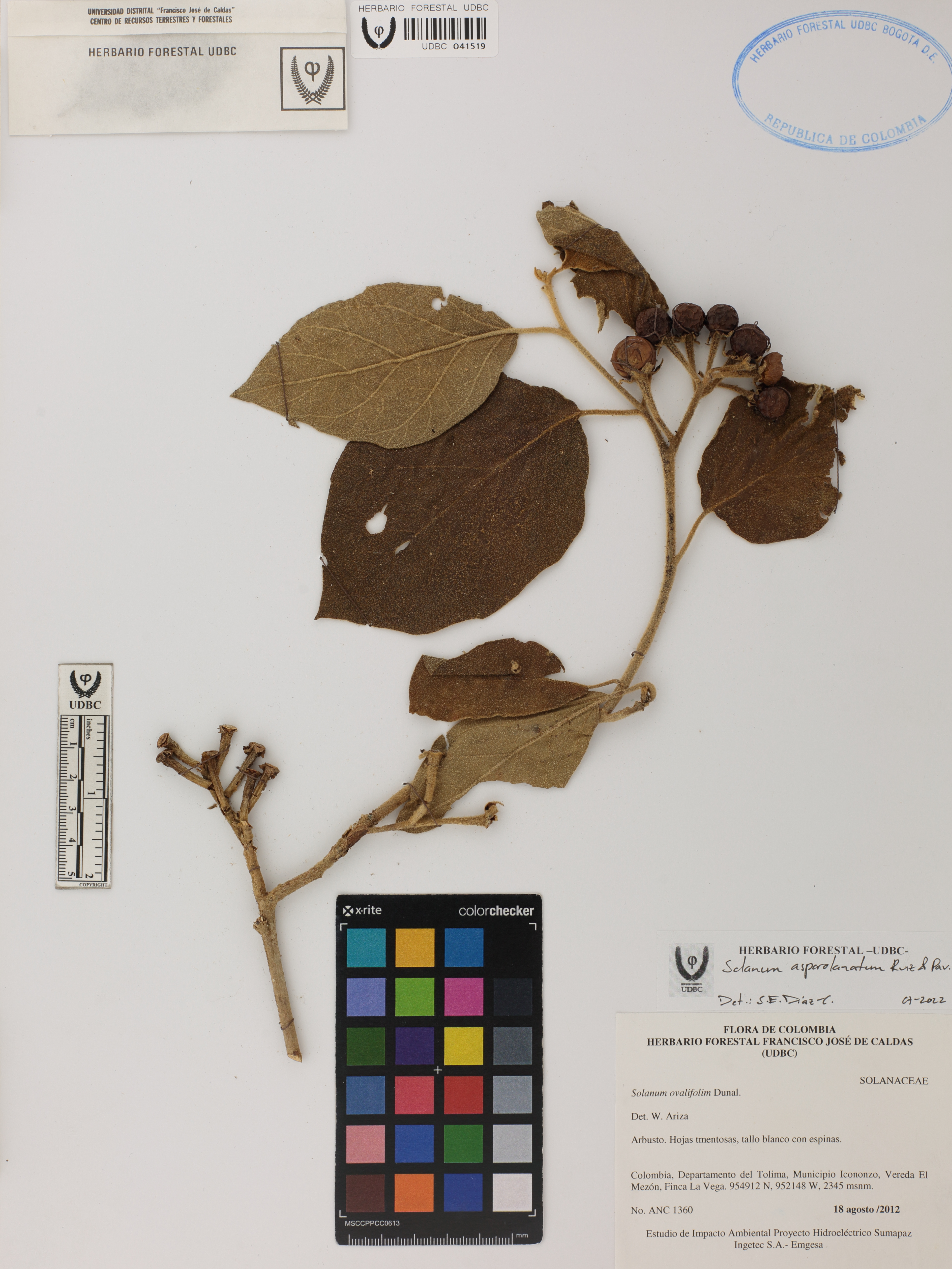 Fotografía del ejemplar SD 1360, determinado como Solanum asperolanatum en el año 2022