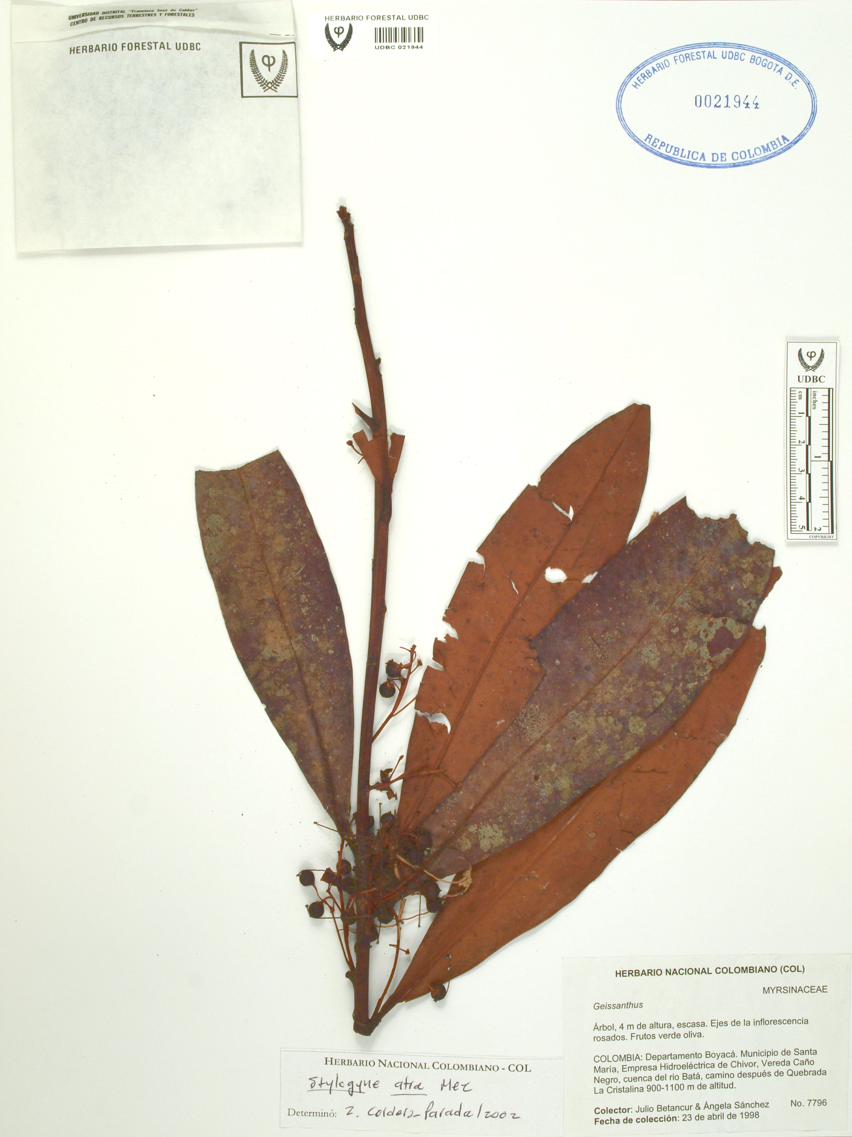Fotografía del ejemplar Betancur, J. 7796, determinado como Stylogyne atra en el año 2002