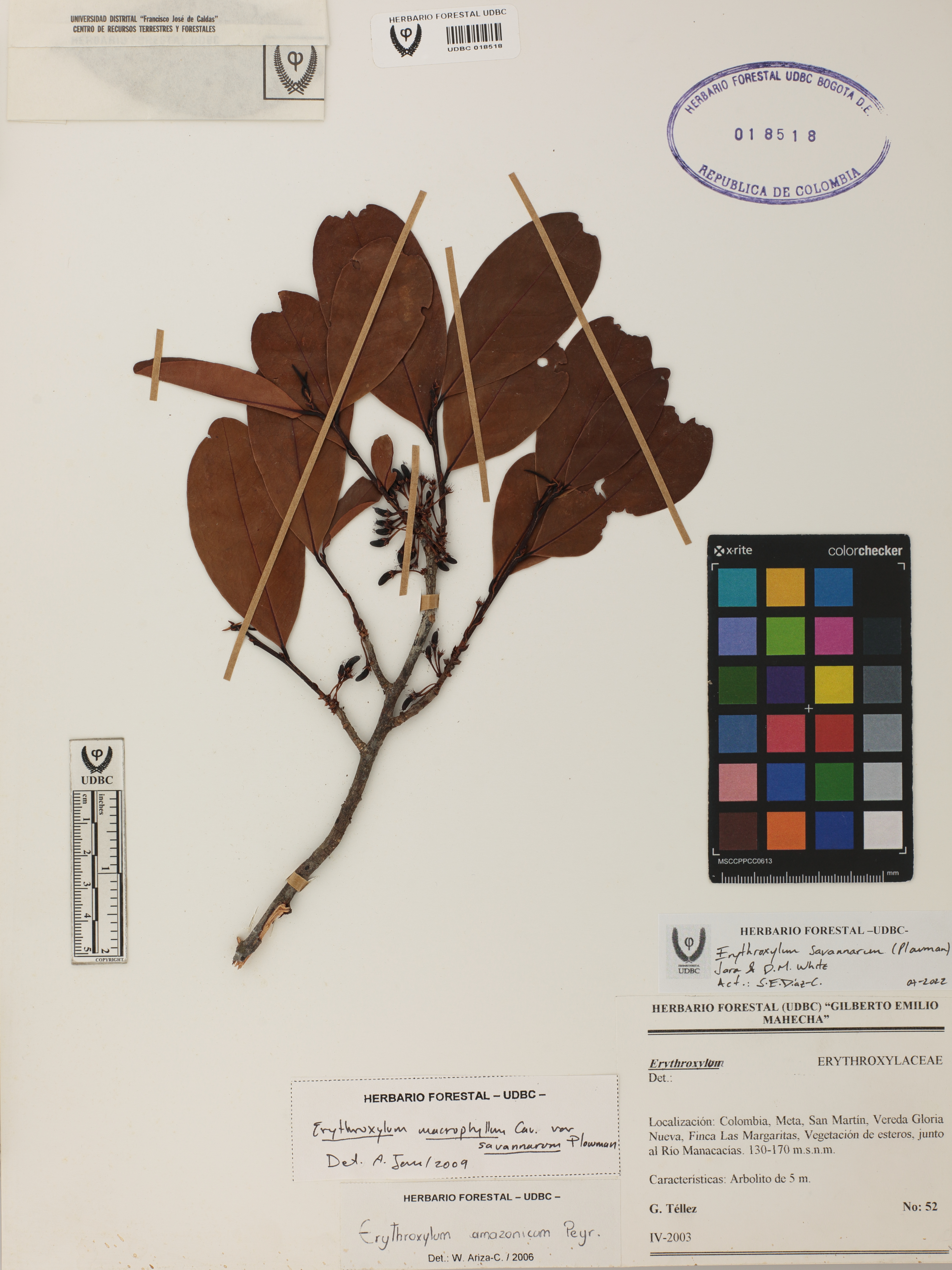 Fotografía del ejemplar Téllez, G. 52, determinado como Erythroxylum savannarum en el año 2009