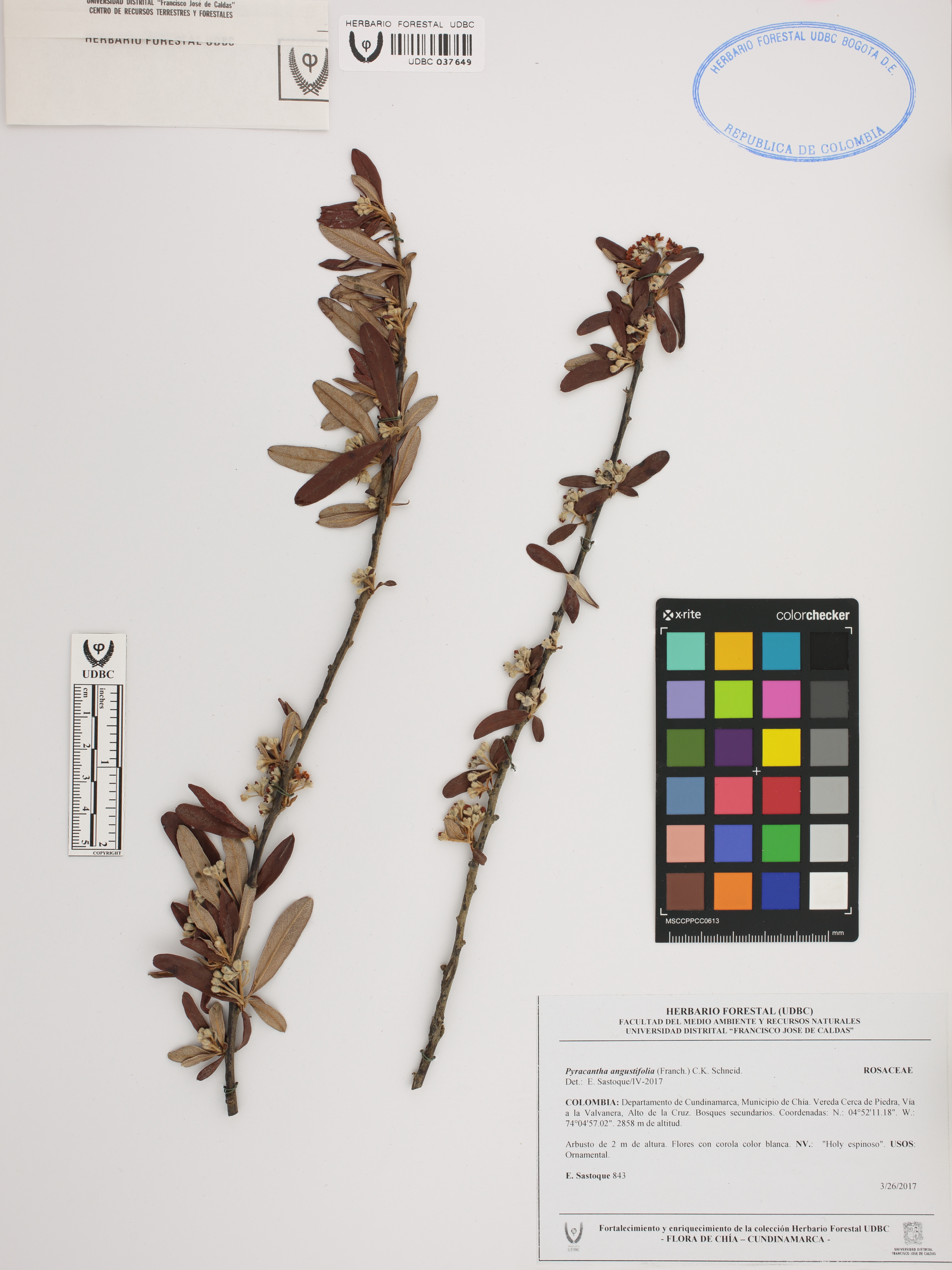 Fotografía del ejemplar Sastoque, E. 843, determinado como Pyracantha angustifolia en el año 2017