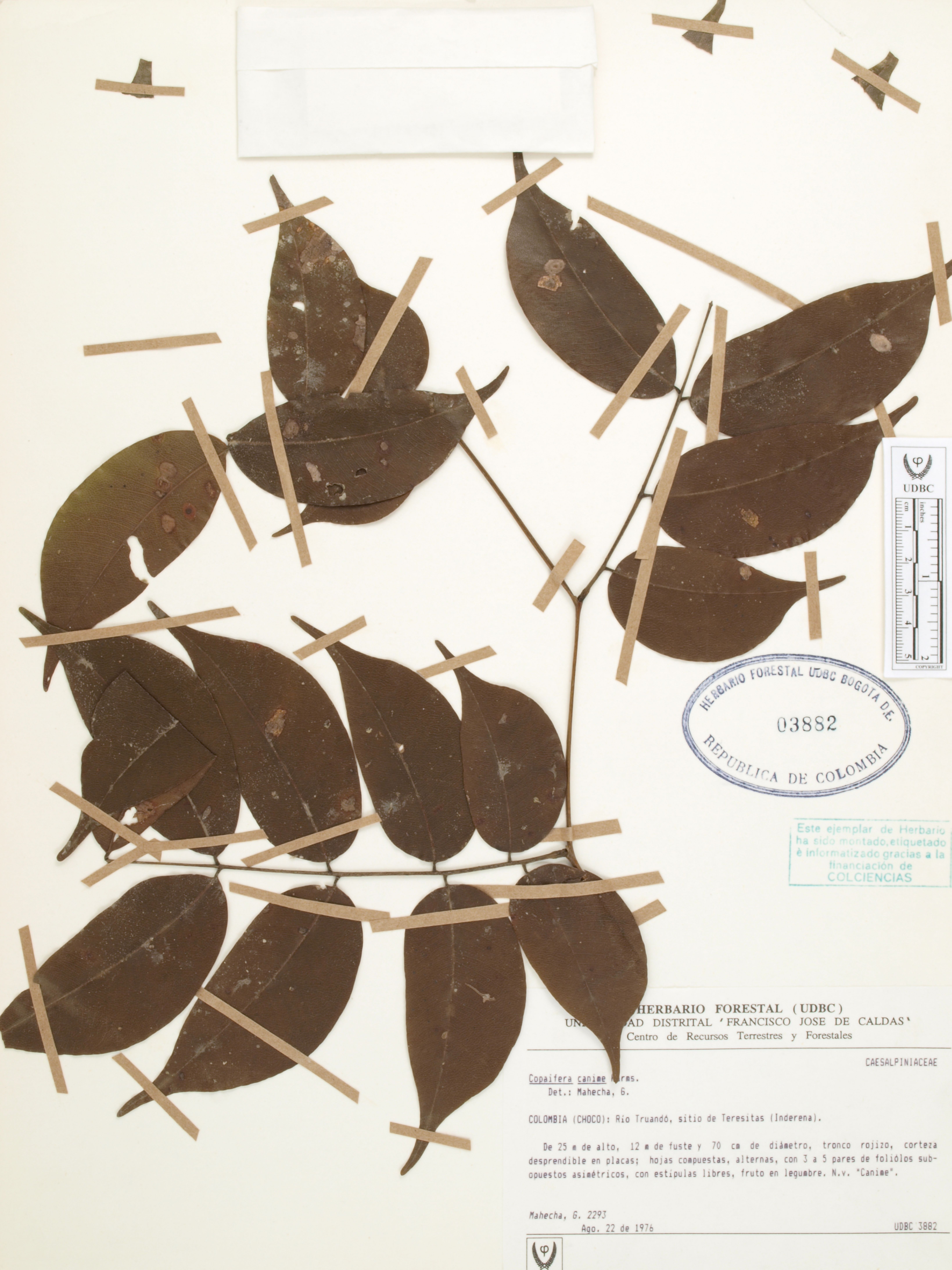 Fotografía del ejemplar Mahecha, G. 2293, determinado como Copaifera canime en el año 1976