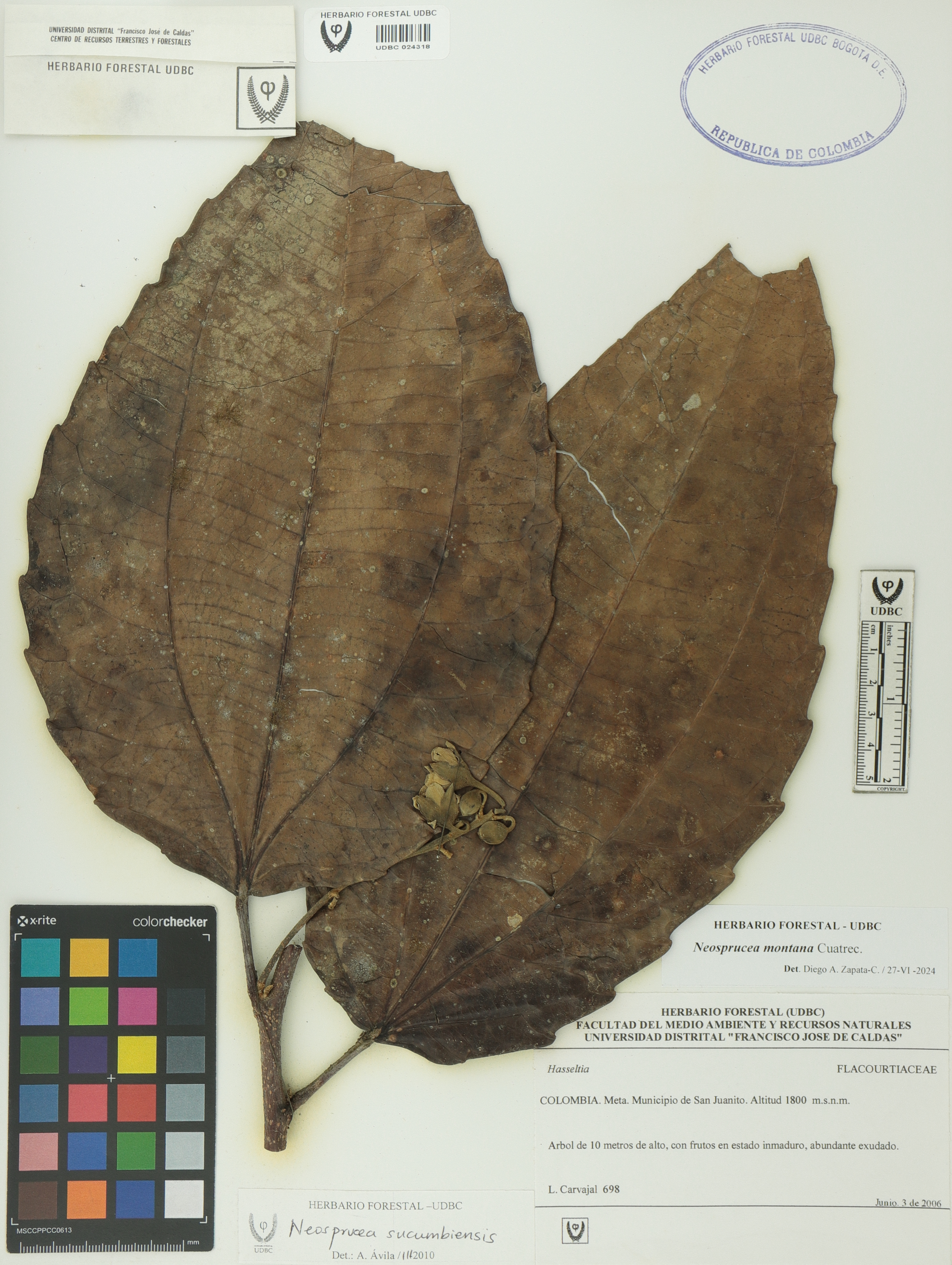 Fotografía del ejemplar Carvajal, L. 698, determinado como Neosprucea montana en el año 2024