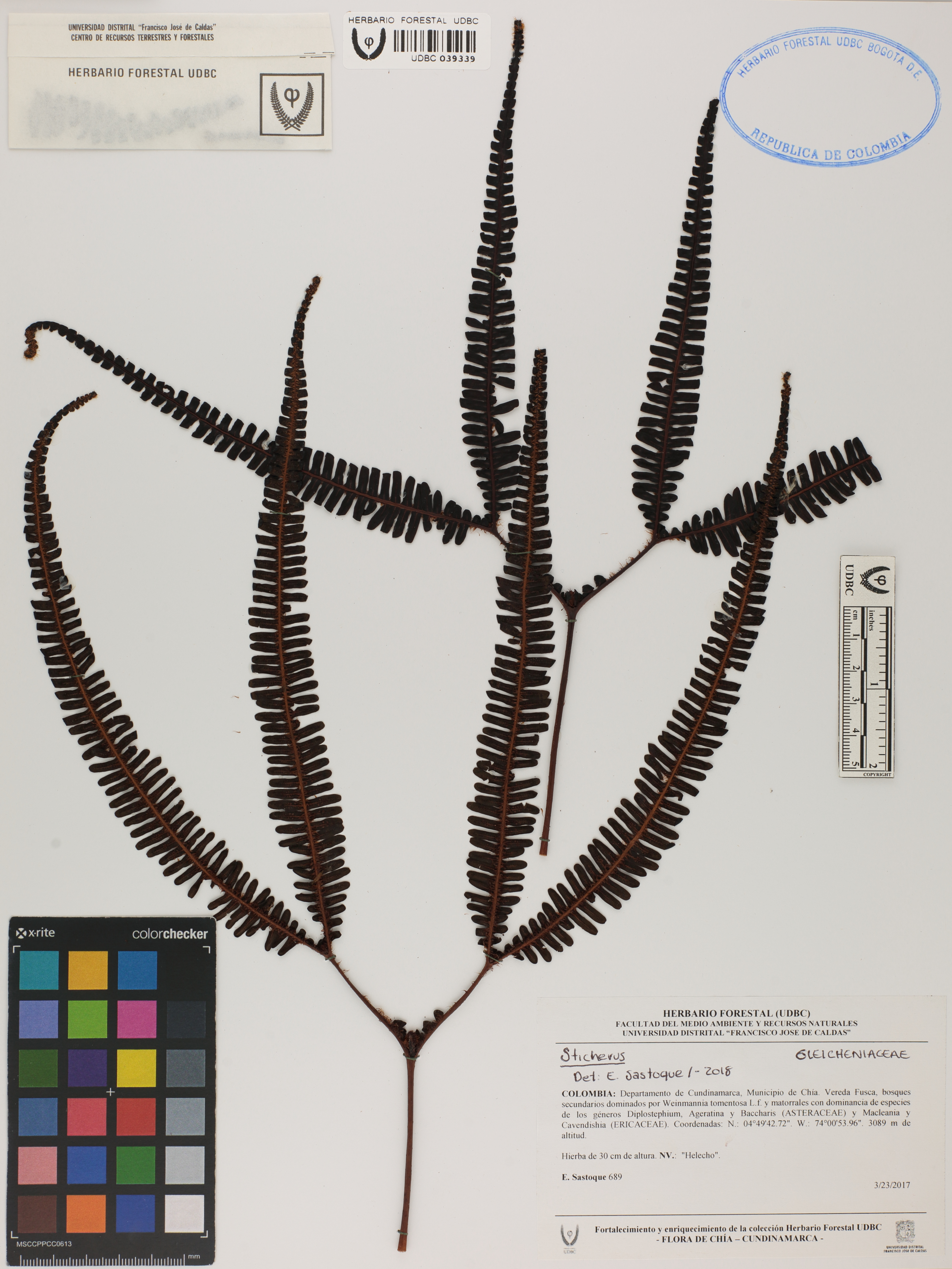 Fotografía del ejemplar Sastoque, E. 689, determinado como Sticherus sp. en el año 2018