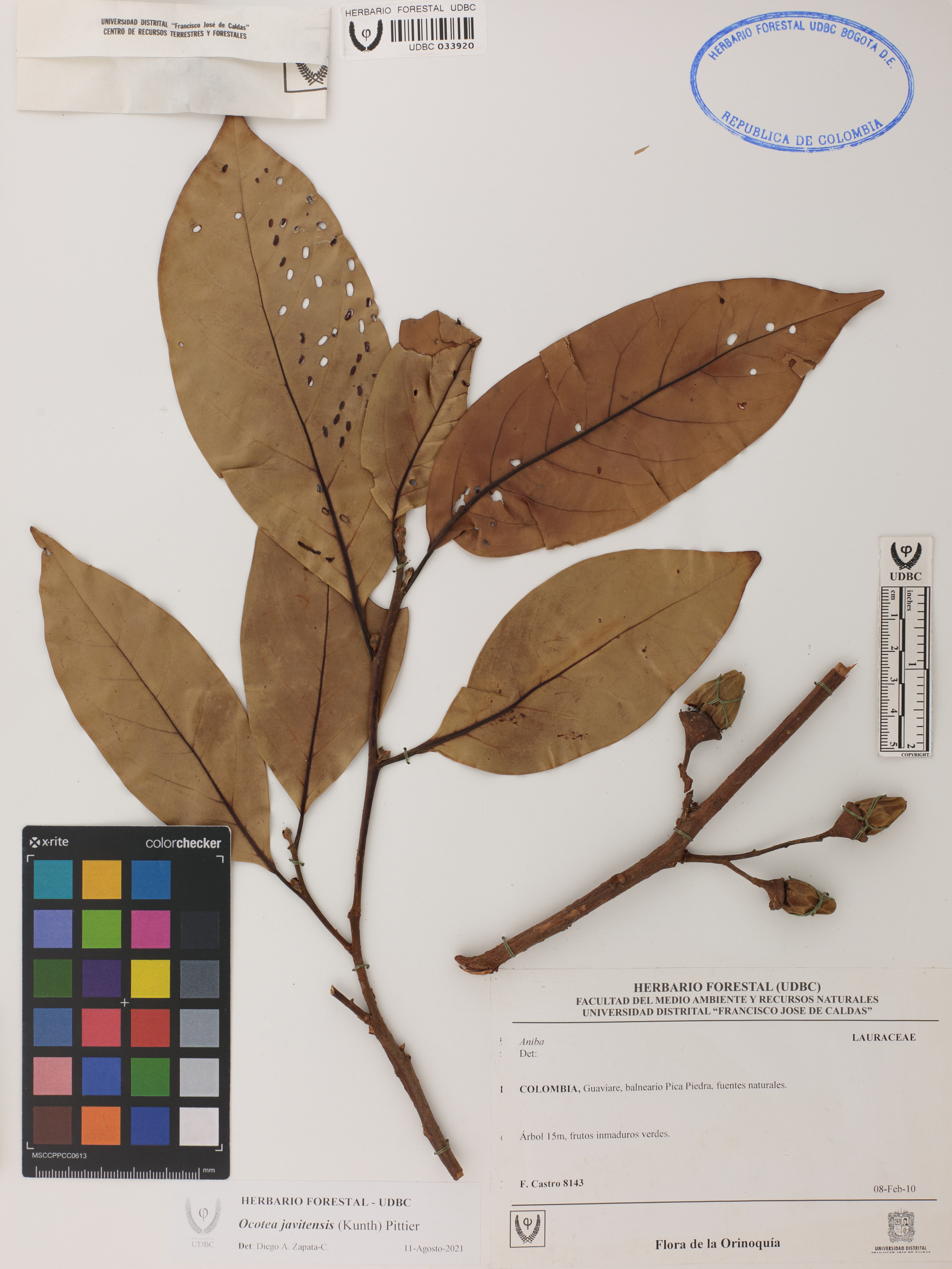 Fotografía del ejemplar Castro, F. 8143, determinado como Ocotea javitensis en el año 2021