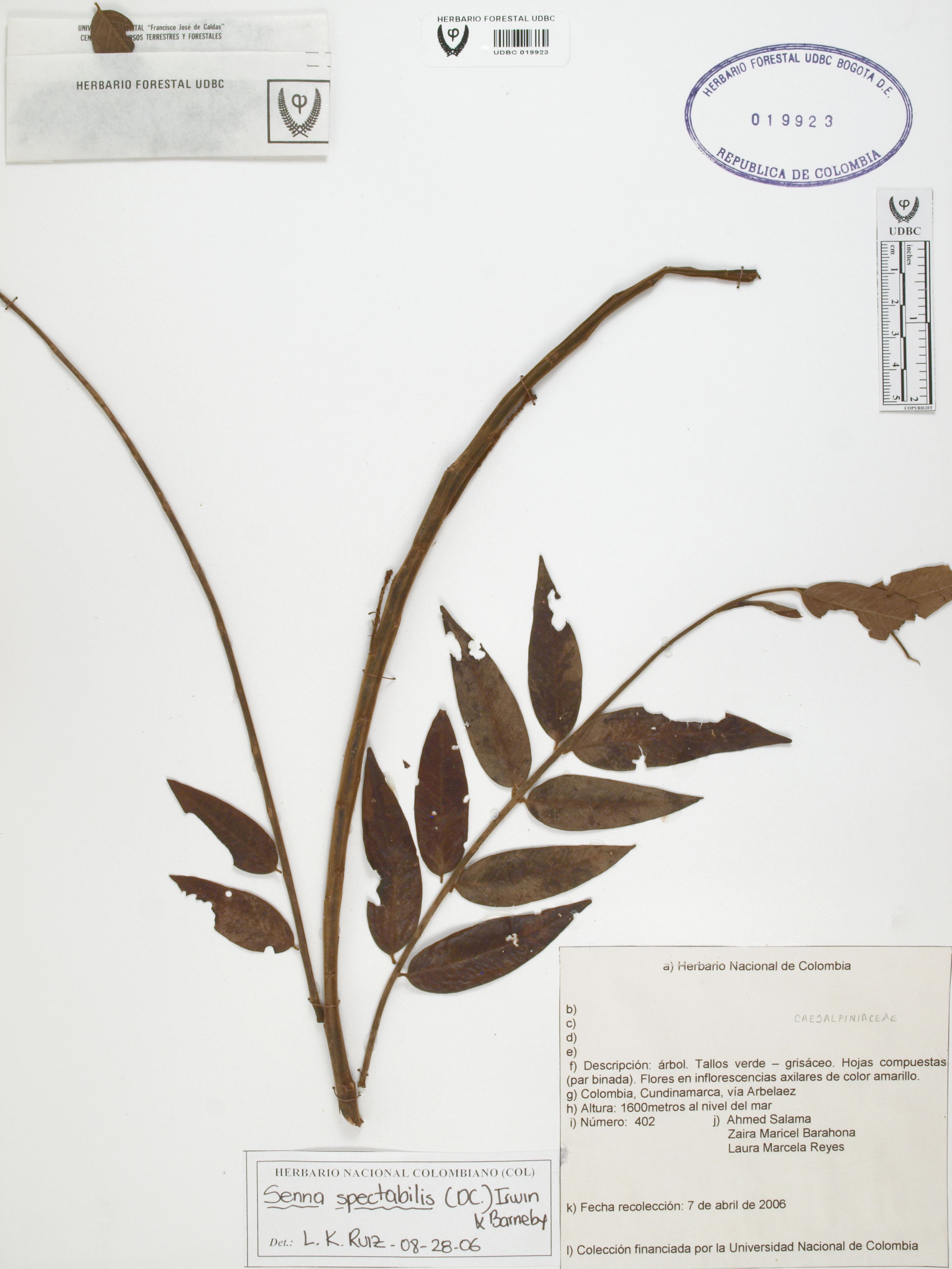 Fotografía del ejemplar Salama, A. 402, determinado como Senna spectabilis en el año 2006