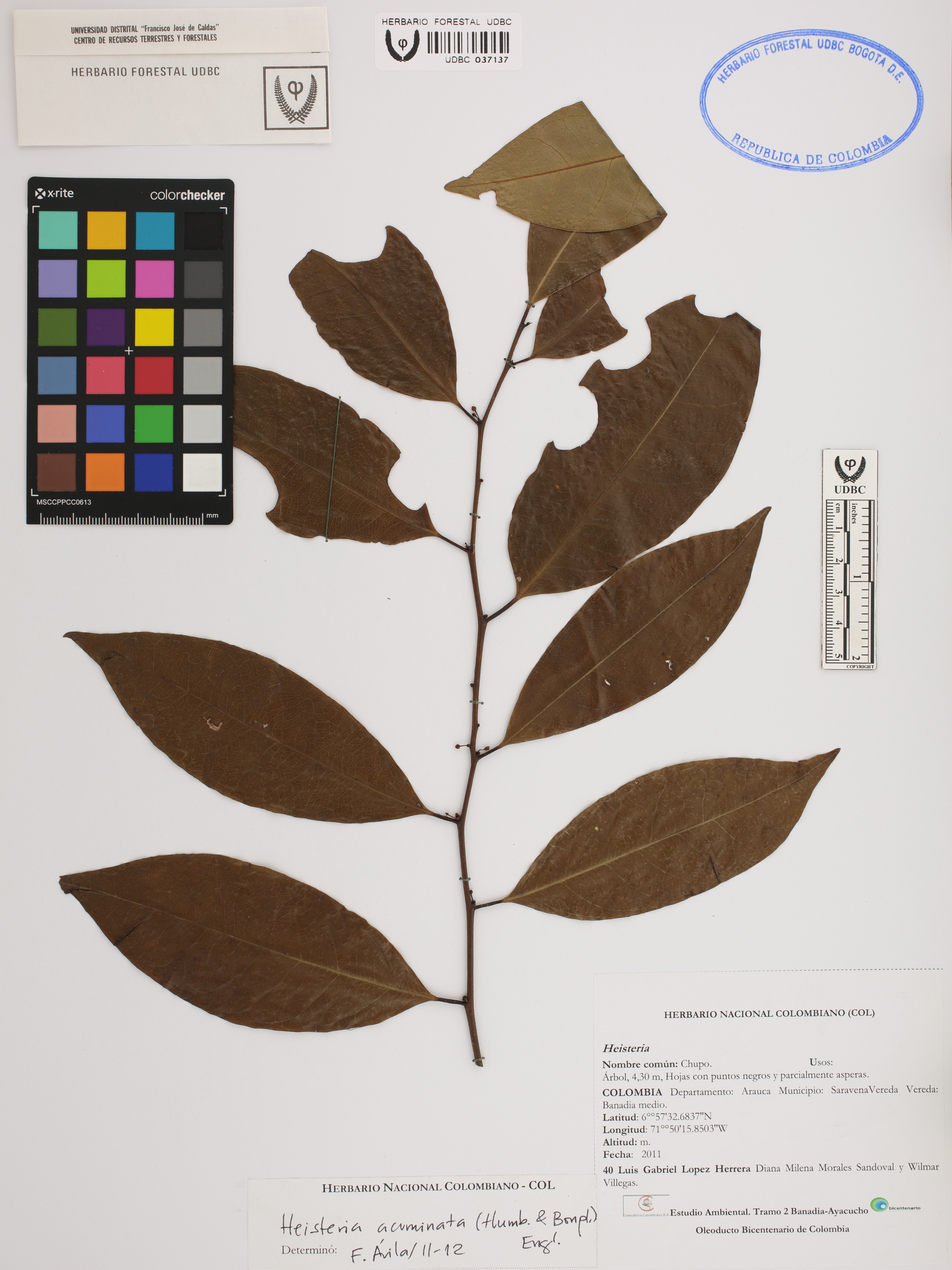 Fotografía del ejemplar López, L. 40, determinado como Heisteria acuminata en el año 2012