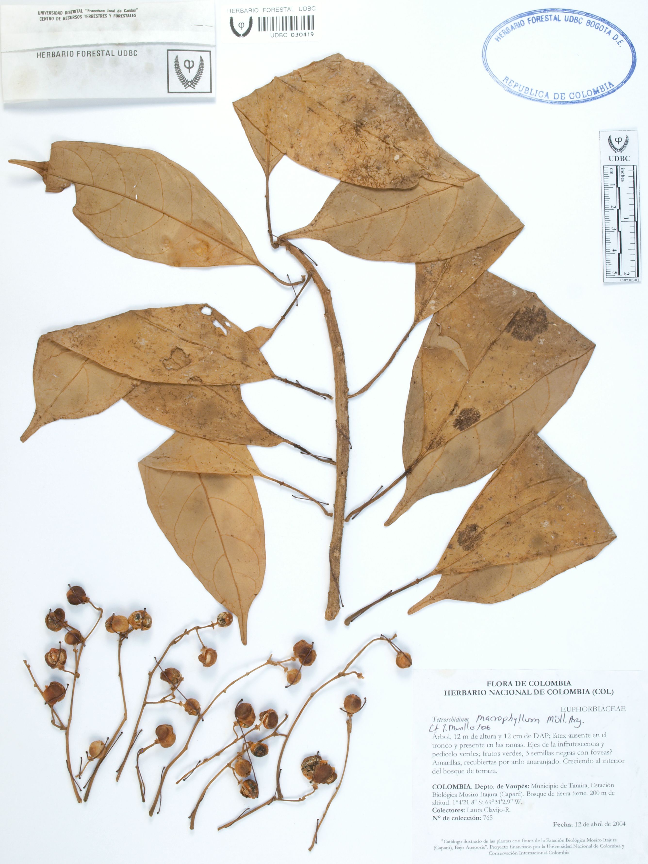 Fotografía del ejemplar Clavijo-R., L. 765, determinado como Tetrorchidium macrophyllum en el año 2006