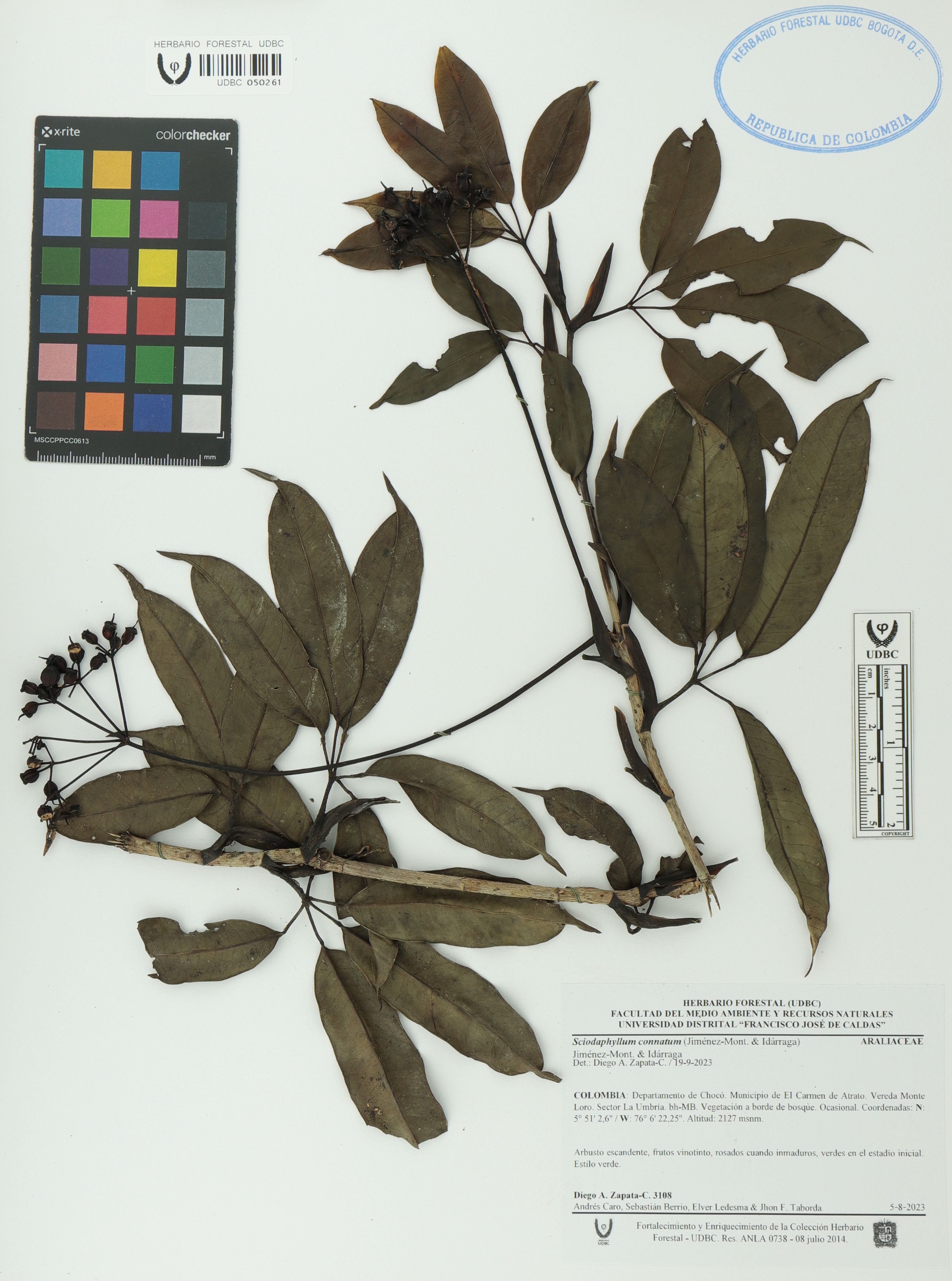 Fotografía del ejemplar Zapata-C., D. 3108, determinado como Sciodaphyllum connatum en el año 2023