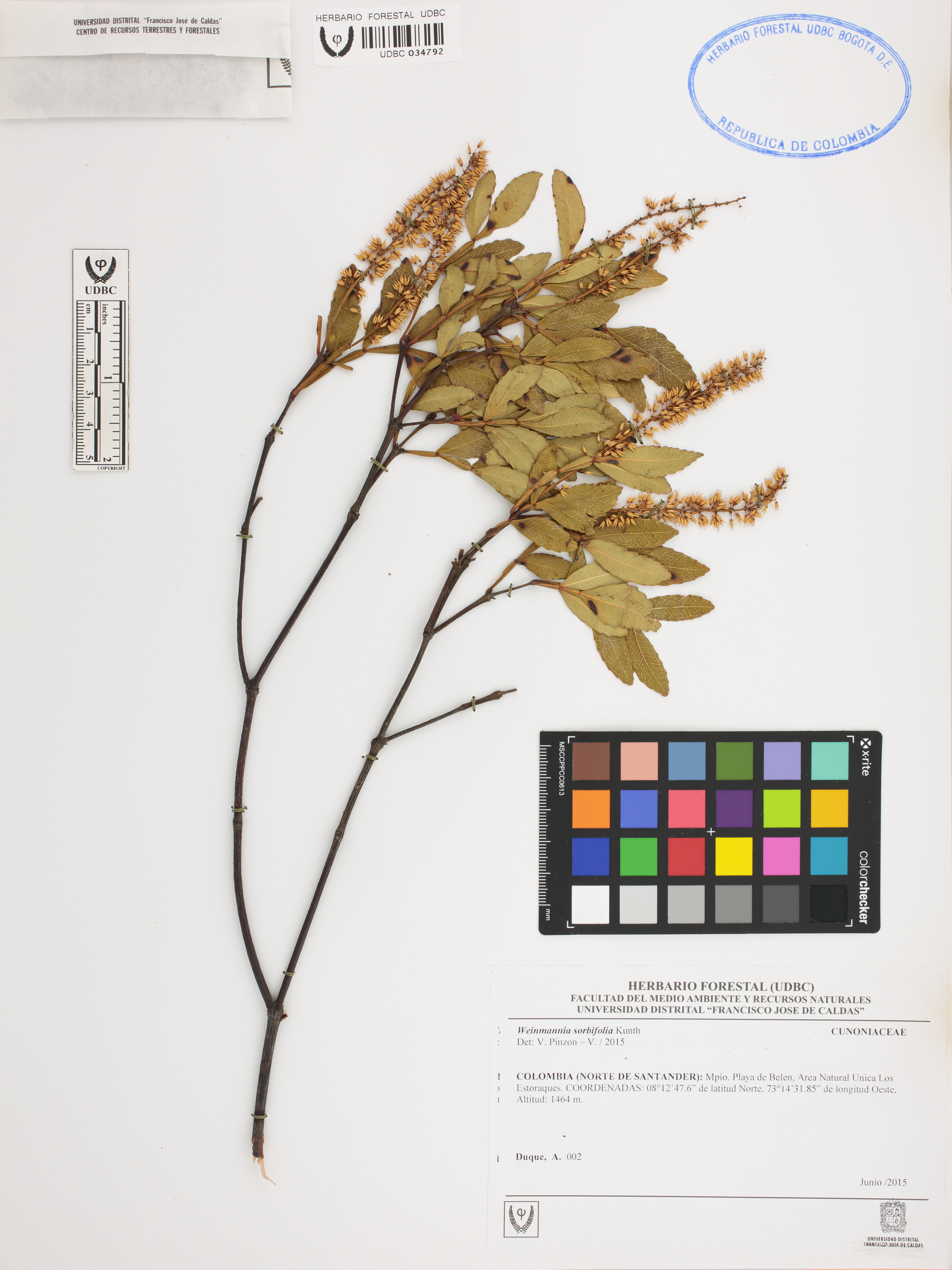 Fotografía del ejemplar Duque, A. 2, determinado como Weinmannia sorbifolia en el año 2015