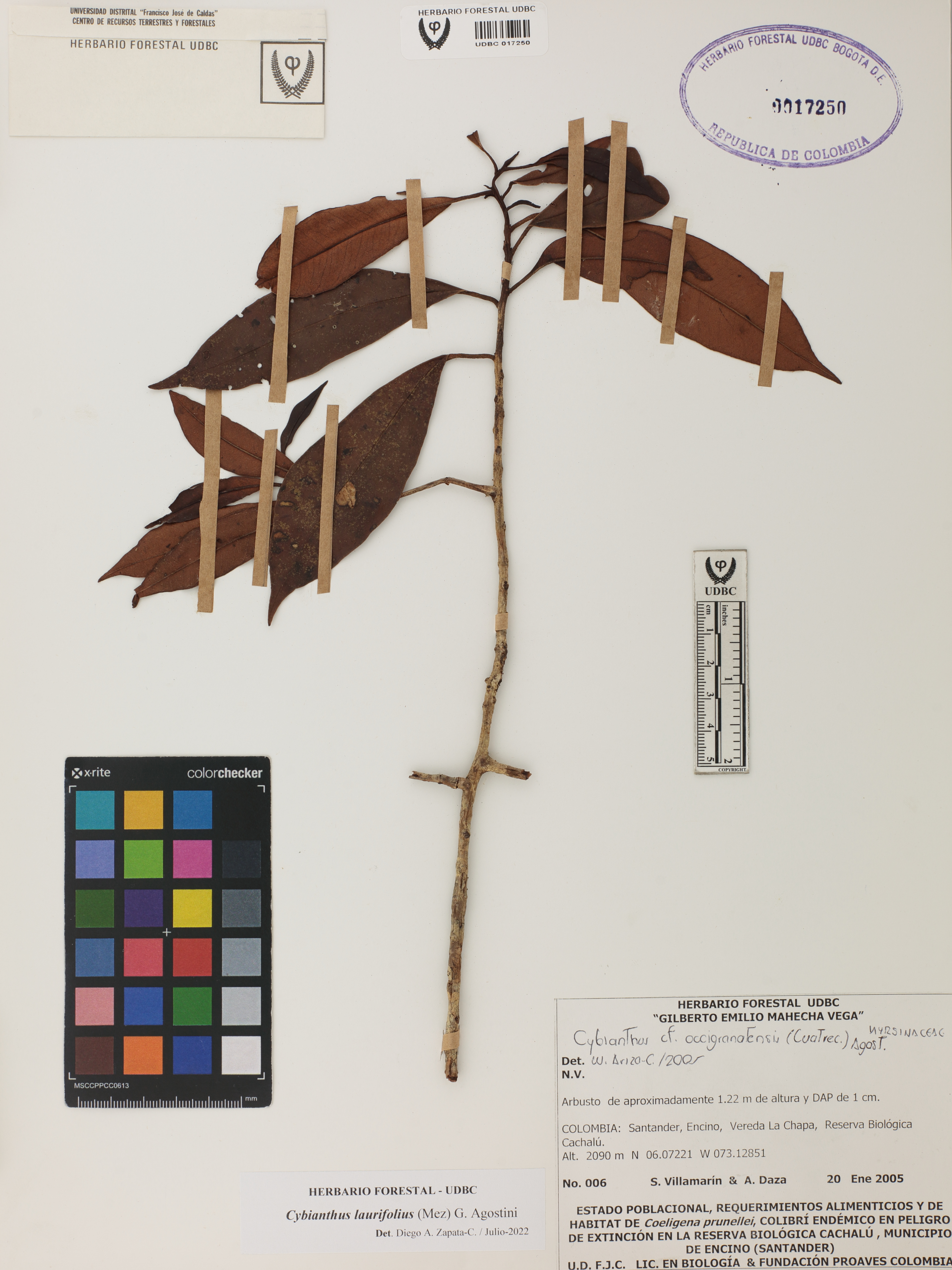 | dc.description | Fotografía del ejemplar Villamarín, S. 6, determinado como Cybianthus laurifolius en el año 2022 | |