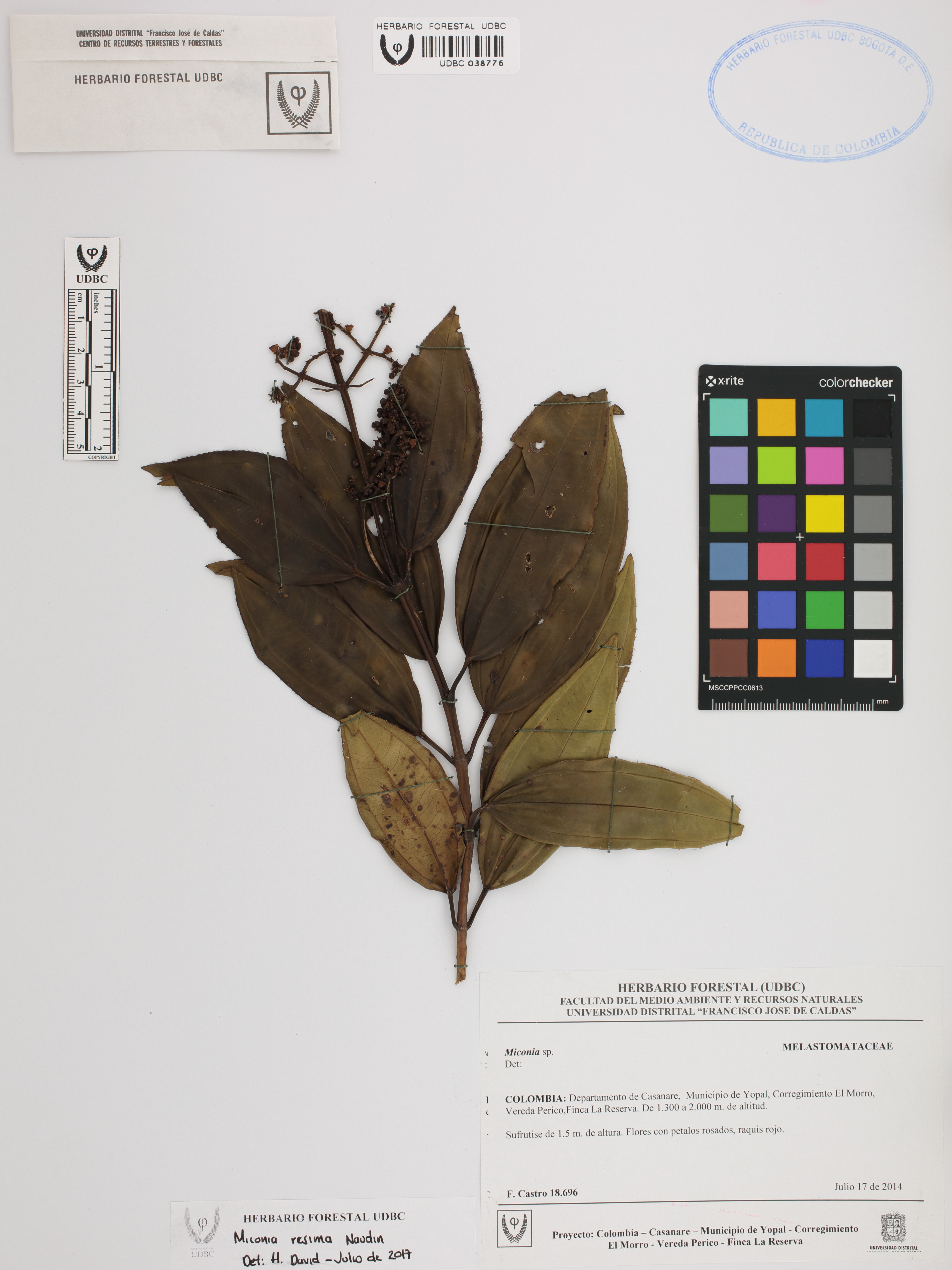Fotografía del ejemplar Castro, F. 18696, determinado como Miconia resima en el año 2017