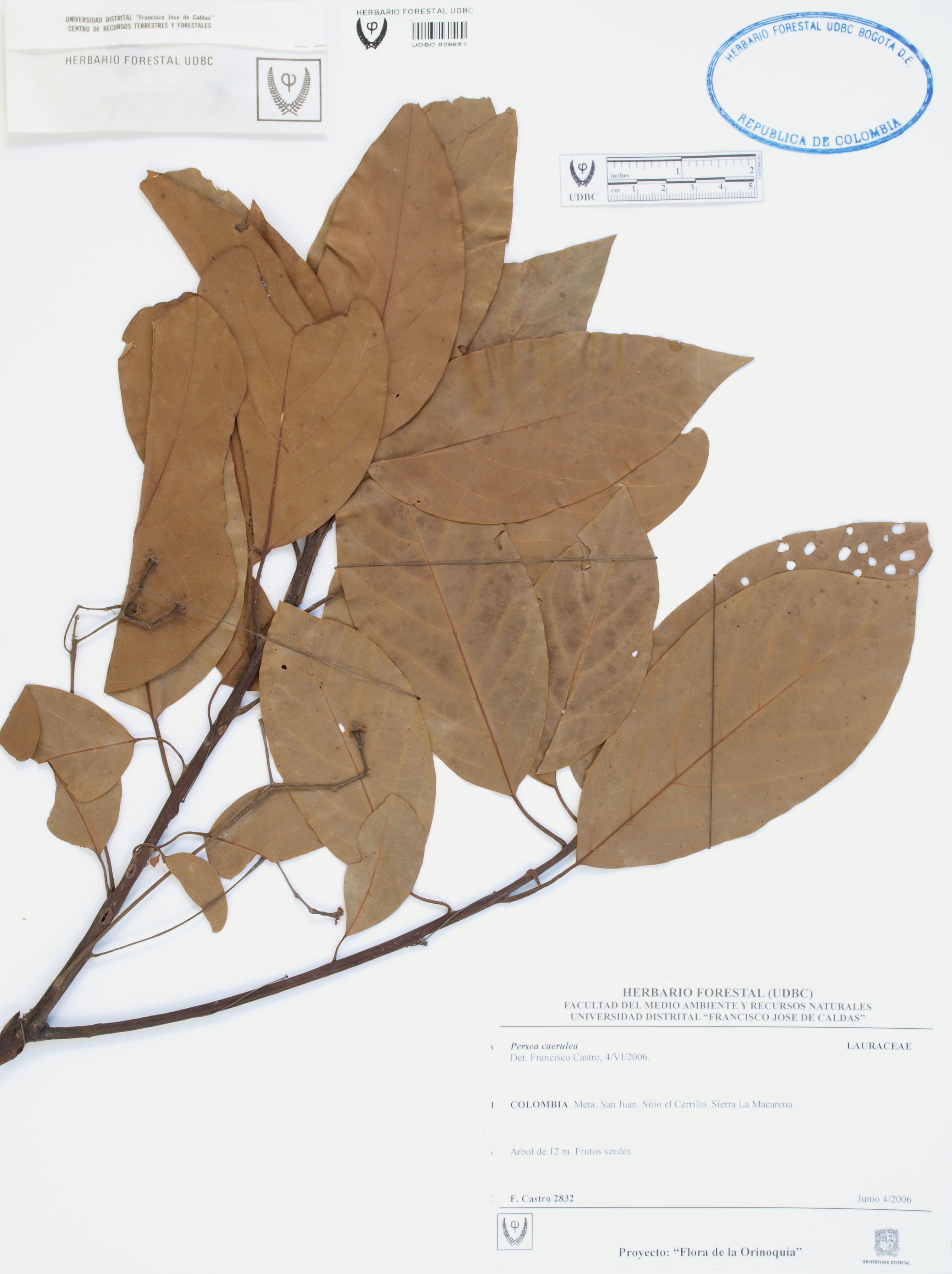 Fotografía del ejemplar Castro, F. 2832, determinado como Persea caerulea en el año 2006
