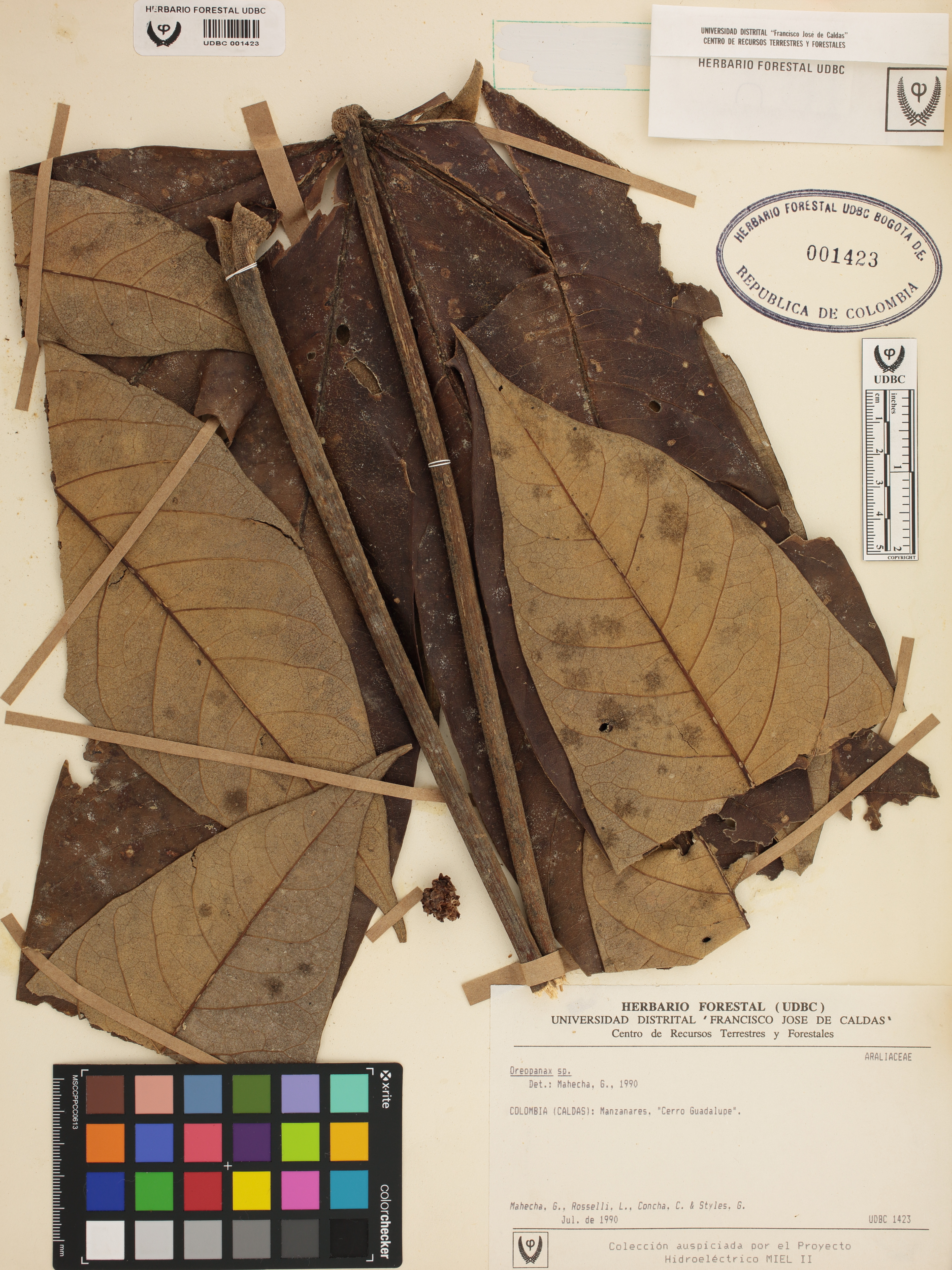 Fotografía del ejemplar Mahecha, G., determinado como Oreopanax sp. en el año 1990
