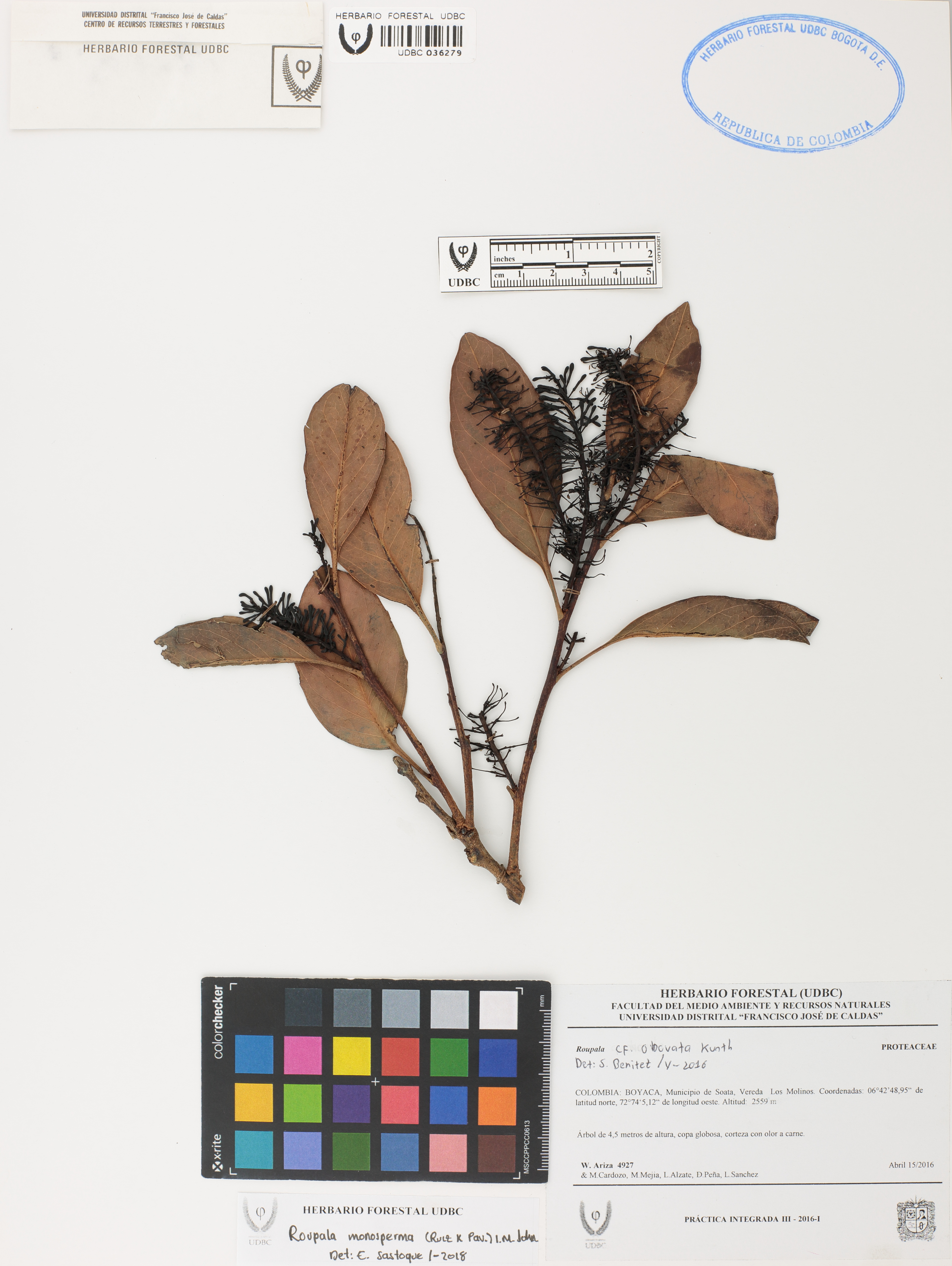 Fotografía del ejemplar Ariza, W. 4927, determinado como Roupala monosperma en el año 2018